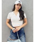 KURENA(GYDA)のニット/セーター「BACK OPENハーフスリーブPOLOニットトップス」を使ったコーディネート