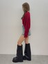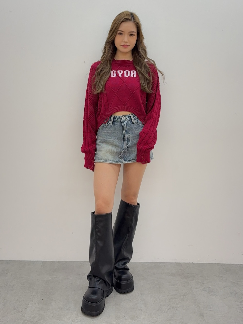 【TOPS】部分的に透かし編みになっているため暑い時期にも涼しく着られるのがポイント🤩☝🏼ロゴのかすれ加工もかわいいです❤️🔥前裾がラウンド型になっており短めです!153cmでおへそより短いです! 【BOTTOM】定番大人気デニムスカート🩵使い回し抜群です!普段はXSサイズですがゆとりを持たせたいのでSサイズで着用しています! 【SHOES】存在感たっぷりの、脚盛れ抜群有能ブーツです⤴️ボリュームがあることにより太もも周りが細見えします👏普段23.5cmでMサイズ着用しています!