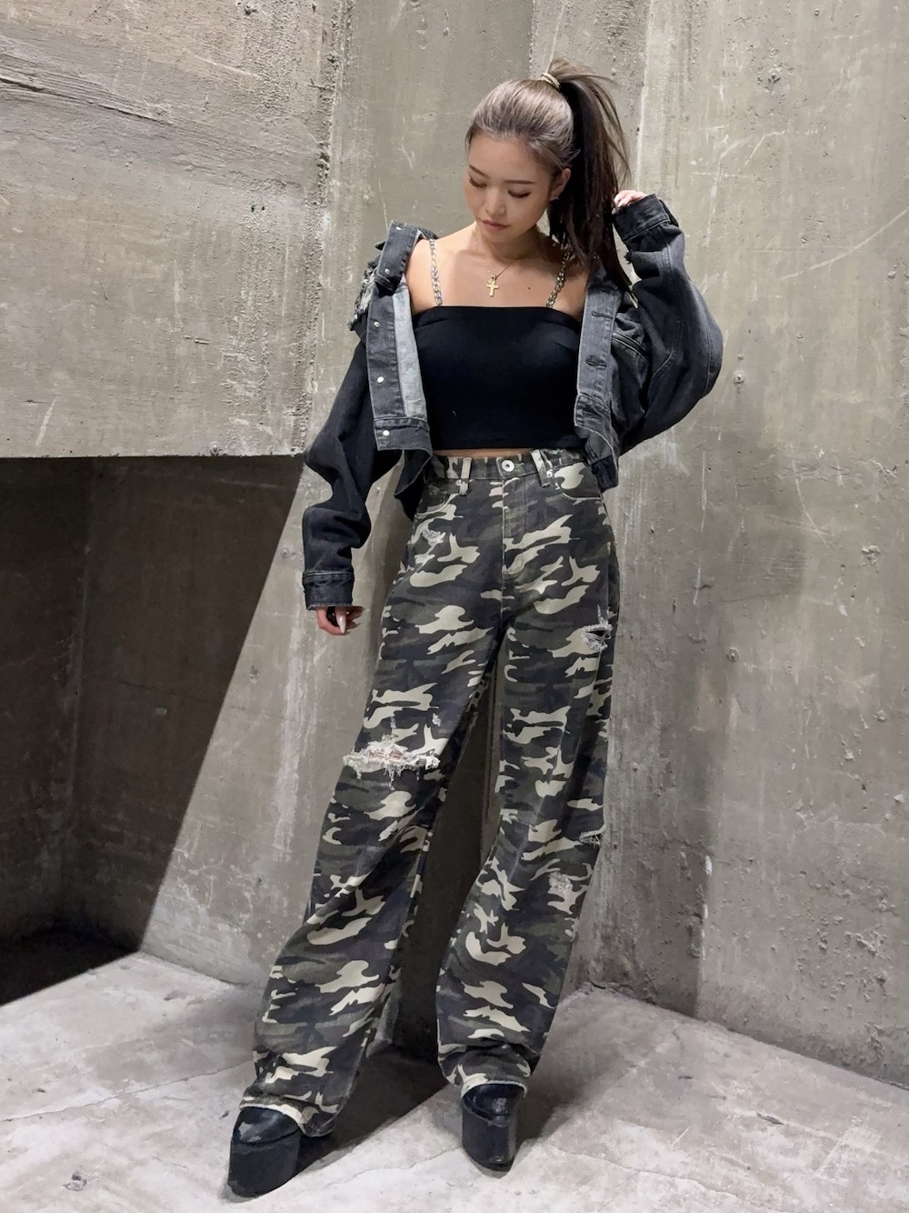 【OUTER】万能に使えるデニムジャケット🤩ダメージやポケットのデザインがGYDAらしさを出してくれます☝🏼❤️🔥153cmで腰周りは完全に隠れる丈感です! 【INNER】肩紐がチェーンになっているのがポイント⛓️🩶チェーンは取り外しが可能になっており、カップ付きでインナーいりません✨153cmでおへそより上めの丈感なので短めです! 【BOTTOM】裾に太さがある分、ウエストが細見えするパンツです🩳💚ダボッと着られるように股下が長めのつくりになっているので高さのあるシューズをおすすめします!153cmでXSサイズ着用しています! 【SHOES】 安定で定番のバルキーショートブーツ👠🖤 ヒールが高く感じると思いますが、底も厚くなっておりますので高低差をあまり感じずに履いていただけます☝🏼✔️ 普段23.5cmの私はMサイズを着用しています!