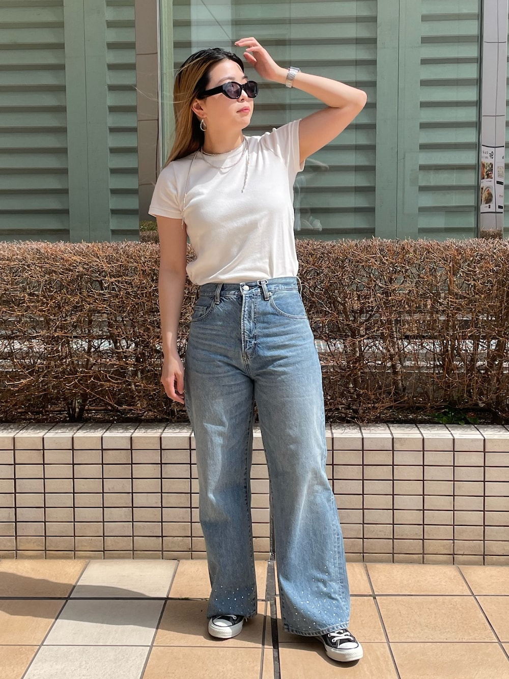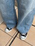 白Tにデニムのシンプルコーデ𓇼 【トップス】 カラーフィットTeeはコンパクトなのに窮屈感なく柔らかい生地感なので着心地が最高です! 程よい厚みもあるため、インナーが透けることを気にせず着れるのが嬉しいポイント♡ 【デニム】 ビジューデザインルーズデニムは、いつものサイズ(私は25inch着用)で、コンバース履いても床にすらないギリギリのサイズ感です! ずるっと履きたい方は、ワンサイズ上げても可愛く履いていただけそうです☺️