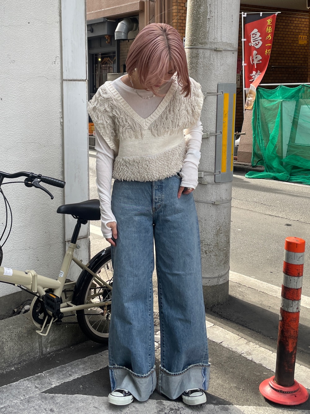 ループ編みや異素材感のあるニットベストを主役にしたコーデで、春らしくトップスはIVYとO.WHTメインでまとめてみました😌 春に大活躍なシアーロンティを組み合わせて 程よく透け感がありよりニットベストを引き立ててくれます!アウターを羽織る際にも、かさばらずフィンガーホールがあるので袖を通した時にもたつかずプチストレスフリーなインナーで毎年大活躍してます😊 デニムはロールアップとウエスト部分にデザインが施さてれいて、シンプルだけどちゃんと拘ってる感じがお洒落で可愛いです! 162cmで25inch着用し、ぺたんこなスニーカーを合わせて引きずらない程度の長さでした🫡ロールアップ部分が縫い付けてないので、身長に合わせて丈感が変えられるのも嬉しいポイントなので、低身長さんから高身長さんの幅広い身長の方に合わせやすいデニムです!