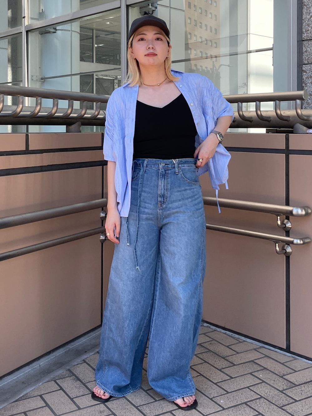 〇トップス #ハーフスリーブギャザーシャツ サイドにギャザーが付いており、丈感調整可能です。 今回はボタンオープンで着ておりますが、前を閉める時は上から3番目まで開けて抜き襟にして着ると可愛いです🙋♀️(私は肩幅が気になるので、同じお悩みある方は是非お試しして欲しいです🥺) サラッと羽織れるハーフスリーブのシャツは毎年使えるので、1枚は持っておきたいアイテムです! 〇インナー #深Vネックパッド付きキャミ 深Vネックだけど、開きすぎてなくて着やすいです! 肩紐がやや調整可能なのが、嬉しいポイント♡ パッドは取り外しできるので、お洗濯の時も別で洗うことも可能です! 〇デニム #ウエストベルトデザインデニム 162cm25inch着用してます✨ 太めでズルっと履けるデニムです! ウエストとおしりがややピッタリでしたが、 太ももからワイドなシルエットなのと、生地感が柔らかいのでとっても履きやすかったです! ウエストベルトがあるので、シンプルになりすぎず履いていただけます。