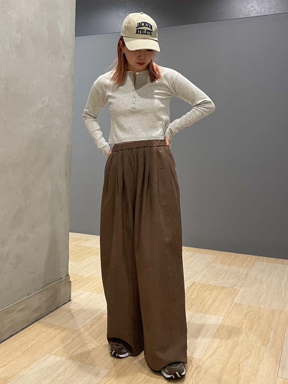 〇トップス #ヘンリーデザインロングスリーブtee しっかりとしたリブの生地でフィットしてくれますが、程よく窮屈感は少ないです! 短丈でお臍より短いので、ハイウエストのパンツと合わせて脚長効果抜群です😌 フィンガーホールもありロングスリーブなのが可愛いポイントです! 〇ボトムス #ピーチ起毛ラフパンツ 162cmフリーサイズ着用。 お臍の高さで履いてます! 総ゴムで履きやすく楽ちんパンツ! ボリュームのあるシルエットなので、 フィット系のトップスとの合わせが可愛いです! ピーチ起毛で生地感しっかりしてるので涼しくなってきた今時期にもピッタリです!