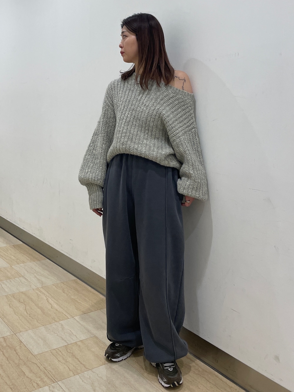 〇ニット #オフショルラメルーズニット ラメ感とゆるっとしたシルエットが可愛いニットです!チクチク感はあまり感じず素肌でも着れました🙇♀️ ボートネックでゆったりした首元なので、ニットの首の詰まり感が苦手な方とってもオススメです!今回ワンショルできてますが、肩落とさずでも着れました😌 〇ボトムス #ピグメントスウェットルーズパンツ Fsize 足元の絞りをしっかりめにしてあげると、カーブのシルエットがでて可愛いです! 小柄さんでも裾を内側に織り込んであげると丈調整でき、着ていただけます🙌 裏起毛で、ボリューム感のある生地感ですが、履いていくうちに腰周りのボリュームはやや落ち着いてより綺麗に落ち感が出てくれました!