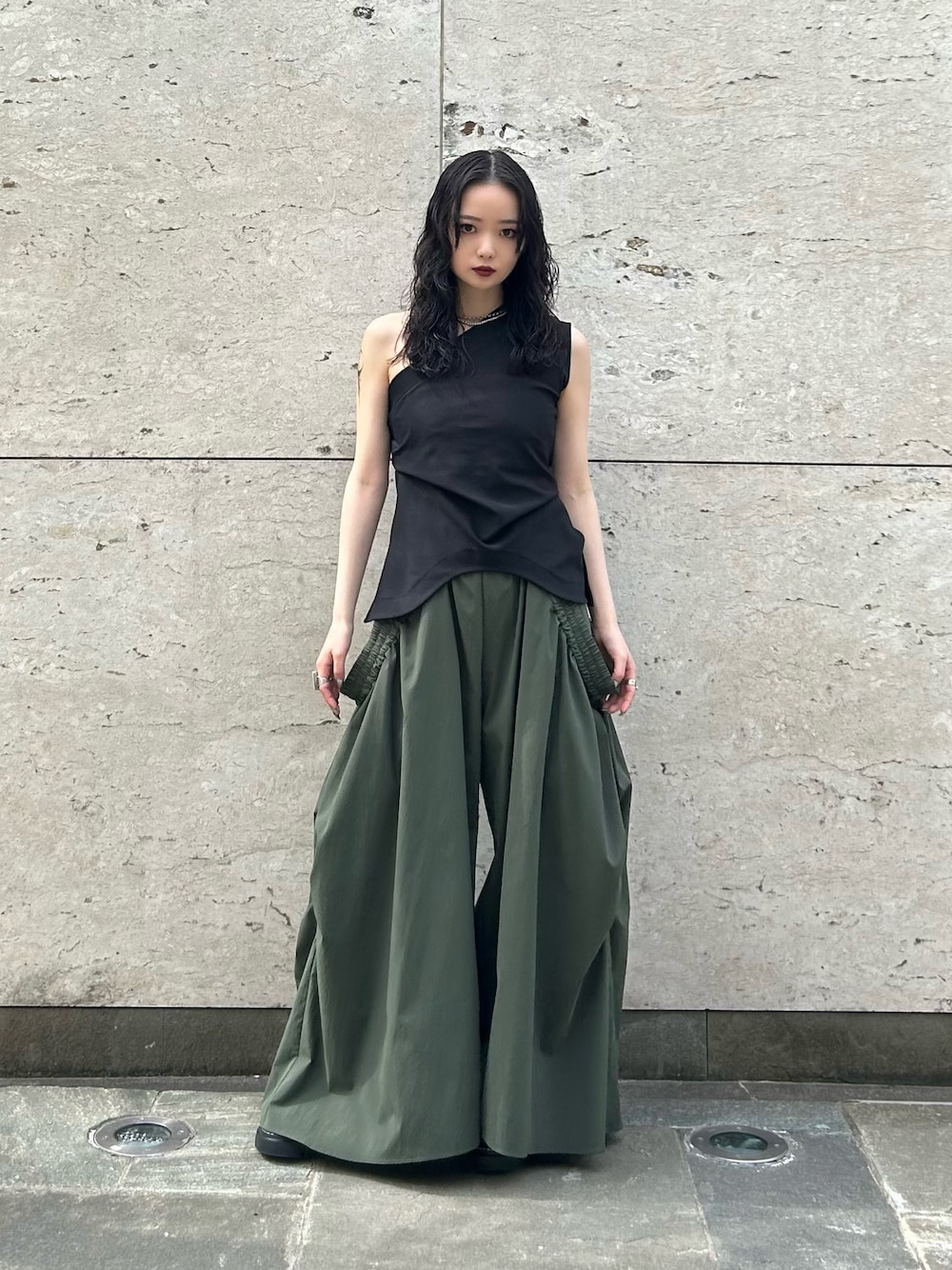 【ROUND HEM ONE SHOULDER TOP】 デコルテが見えすぎないため挑戦しやすいワンショルダートップス。 柔らかく伸縮性に優れたカットソー素材を使用しております。ウエストに入ったタックがくびれを綺麗に見せてくれ、ボトムス選ばず着回しが楽しめる一着です。 【【ROUND GATHER WIDE PT】 トップスと同素材のワイドパンツ。ウエストは1周ゴムギャザーのため、ストレスフリーで着用いただけます。 Tシャツ、シャツ、タンクトップ等着回しが楽しめる一着。