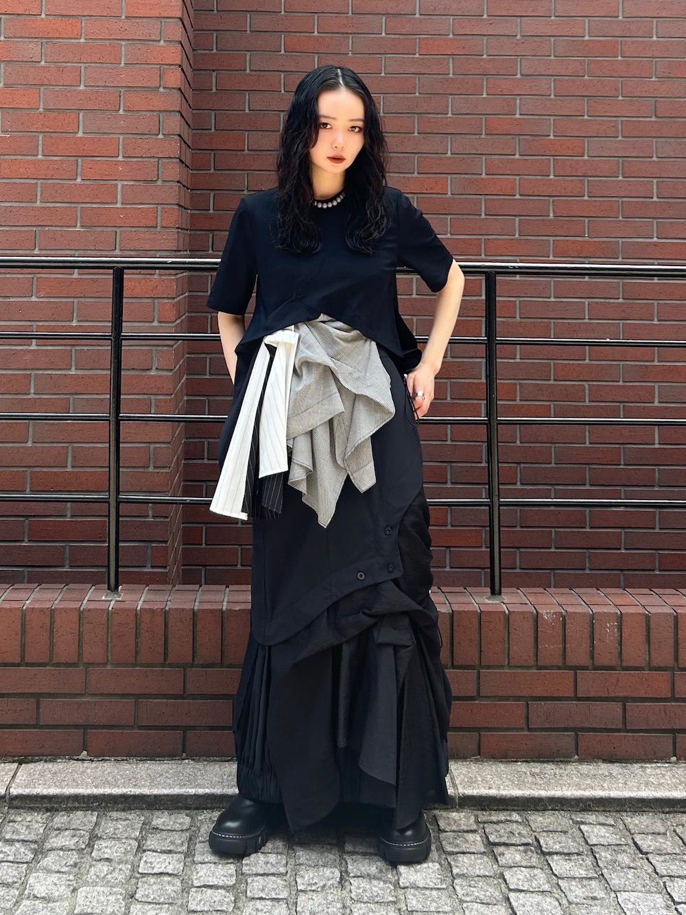 REINAのスカート「PATTERN MIX SHIRT SK / パターンミックスシャツスカート」を使ったコーディネート