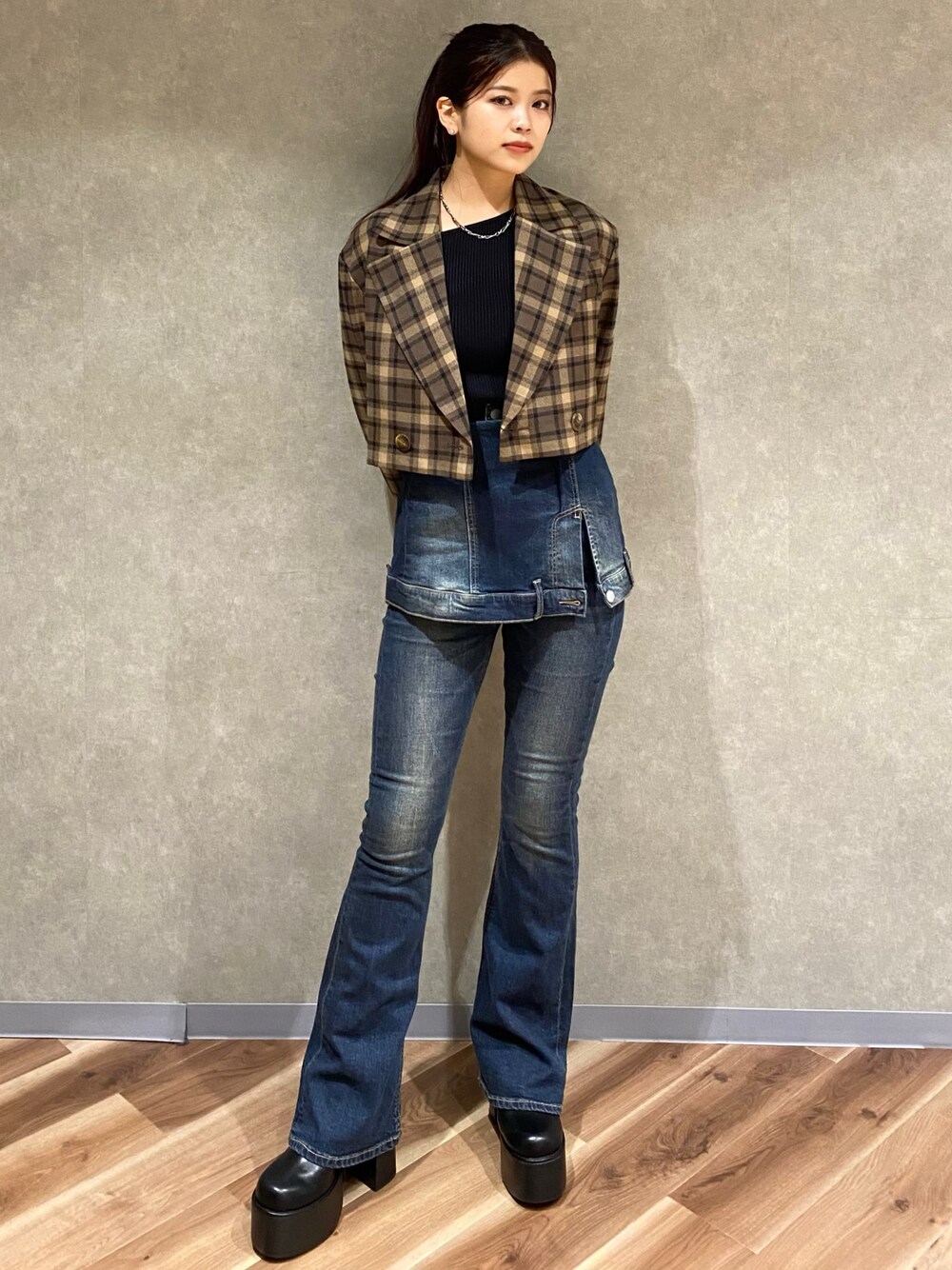 🧡🧡着るだけでオシャレ🆙コーデ🧡🧡 ●ジャケット オーバーサイズのジャケットをショート丈にしたver🐾 大きめの襟で小顔効果💮 ボタンを開けたままでも閉めてもカッコよく着ていただけます🌻❤️ (ボタンを閉めたら160cmでおへそが少し出る程度) ●トップス 程よい露出で肌を見せすぎないので初めて露出をされる方もチャレンジしやすいトップス🔥👏 袖が長めになっているので、腕が細長く見えます👀 店頭やスタッフ内でも大人気トップス🔥 (160cm おへそが少し出る程度) ●パンツ 今季トレンド‼️🩷🩷🩷 レイヤードスタイル✨✨ フレアパンツのみでも着用◎ 伸縮性が高いので美脚効果💮です!!! レイヤードでイマドキ感満載&スカート部分をヒップ周りをカバーしてくれるので、骨盤やヒップが気になる方でも着用しやすいアイテムです🙆♀️❤️❤️❤️ (160cm Sサイズ ヒール無し・・・裾がつきます) ●シューズ 毎年店頭やネットでも大大大人気✨✨ 履くだけで!!!美脚になるシューズです🦵✨ 高低差が無いので、長時間の外出にも向いており、サイドゴア仕様となっているので着脱がしやすいです!! ワイドデニムでの着用も良し、スカートやワンピースとの合わせも良いです🌈🩷 この秋冬、絶対に持っておくと損がないアイテム🎶 (普段24.5cm Lサイズ着用)