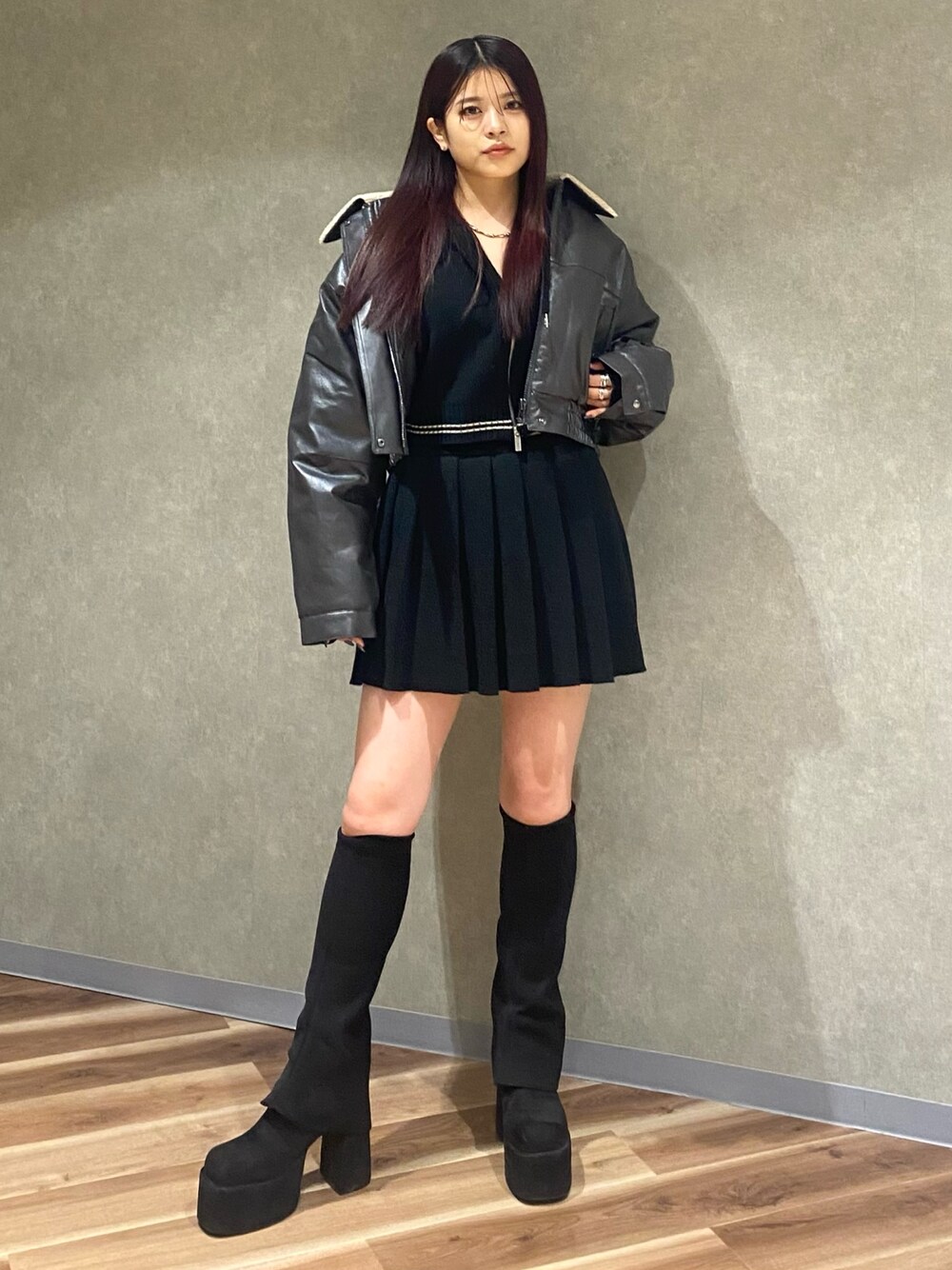 藤吉希羅々(EMODA)のブルゾン「フェイクレザーボアブルゾン」を使ったコーディネート