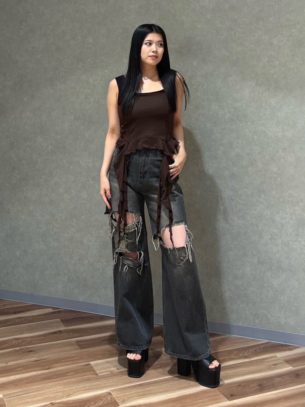 藤吉希羅々(EMODA)のデニムパンツ「ボールドリップドルーズジーンズ」を使ったコーディネート