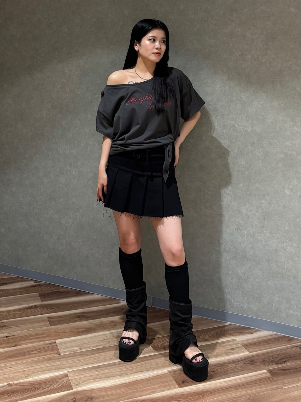 ●トップス ワンショルにもできるTシャツ🩶❤️ サラッとした着心地となっているため、水着の上から着てもかわいい🫶 (160cm おへそが見えない丈感) ●スカート ウエスト部分がリブで履きやすい👗 裾のダメージ具合がとても可愛い❤️🥹 (160cm Sサイズ着用 膝上10cm程度) ●シューズ 店頭でも大人気❤️🫂👠 履くだけで -5kgに見えて脚が8割に見えるシューズ👀 傾斜がなくて軽量ですのでとても歩きやすいです🔥 (普段24.5cm Lサイズ着用)