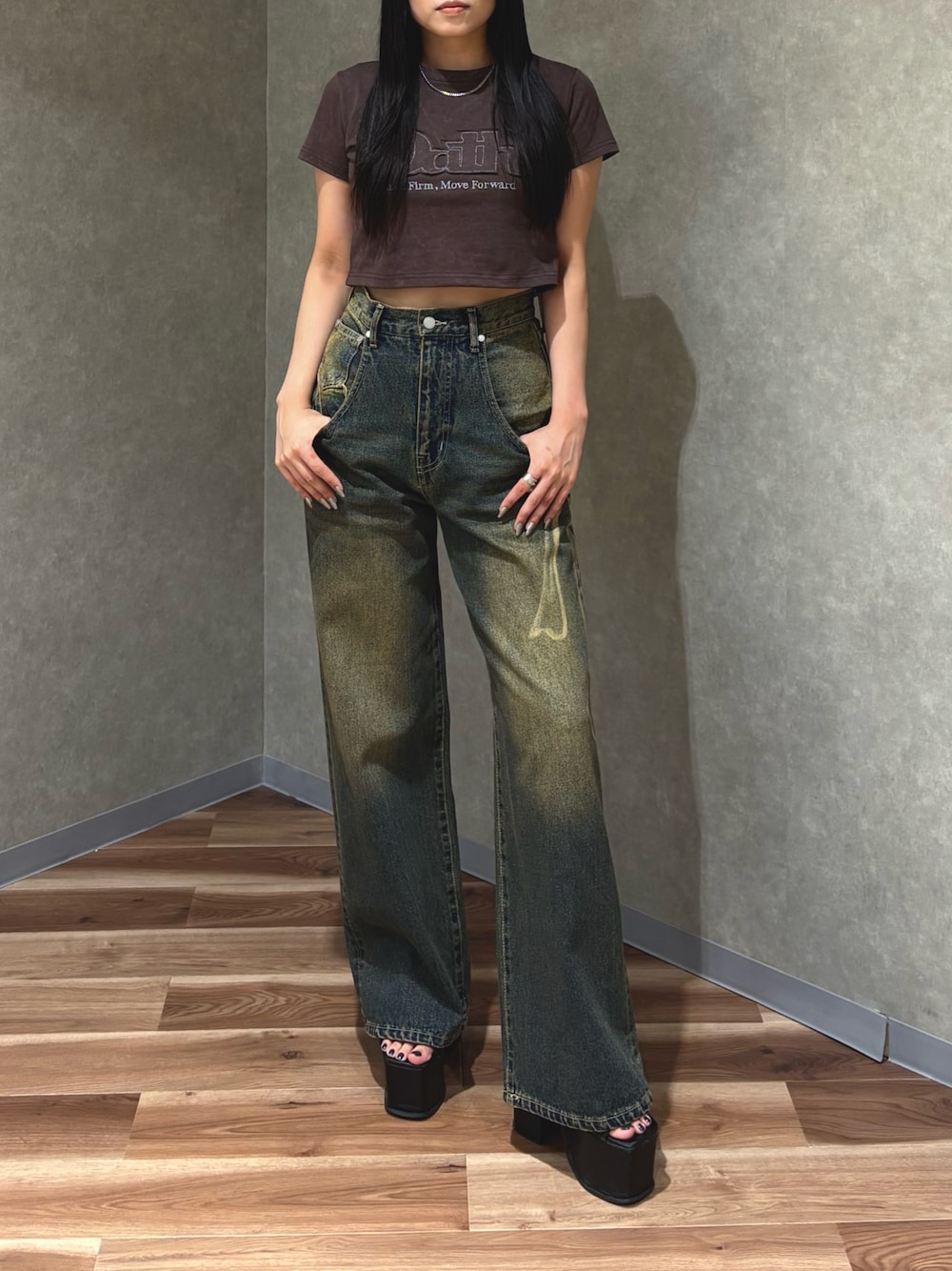 藤吉希羅々(EMODA)のデニムパンツ「リボングラフィックルーズジーンズ」を使ったコーディネート