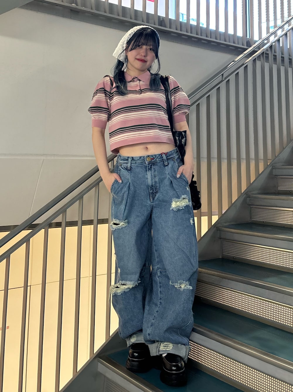 【トップス】 サラッとした生地感(薄手)なので真夏でも涼しく着て頂けます♡ 15時cmでおへそのちょっと上ぐらいなのでハイウエストボトムと合わせるとお腹は見えにくくなります!! 【ボトム】 153cm/Mサイズ着用でロールアップしてます! ゆるっとなシルエットですが腰周りは締まって見えるようなアイテムです◎! なんと言ってもバックのPOSTOKYOの刺繍も可愛い♡ 【バッグ】 A4ファイル、PC、うちわも入る大容量タイプです!!♡ 内ポケットも付いているので中で小分けにするのにも重宝します★ 【シューズ】 普段Dr.MartensをUK5(24cm)を履いていてMサイズがジャストサイズ、 Lサイズだと少し余裕もできるので足が痛くなりにくいです♡ 幅広の方は特にLサイズがおすすめ!!