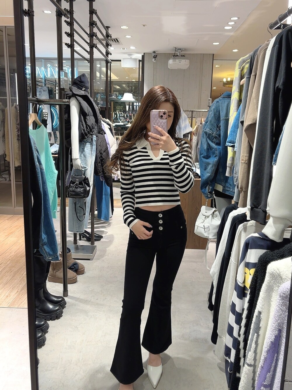 <きれいめカジュアルコーデ> 【トップス】店頭で大人気のポロニットトップス♡デコルテを綺麗に見せてくれて女性らしさを出してくれます!伸縮性抜群なので着心地がとっても良いのもポイント✨ 【ボトムス】3つボタンのハイウエストスキニー✨美脚効果,足長効果がバツグンです✨後ろのウエスト部分がクロスになっていてショート丈のTOPSと合わせると肌見せできて可愛いです♡ 【シューズ】GYDA定番アイテムのポインテッドミュール✨足がキレイに見えるように拘って作られているのでどんなパンツに合わせて頂いても相性抜群です!私は23.0でMサイズ着用してます♡