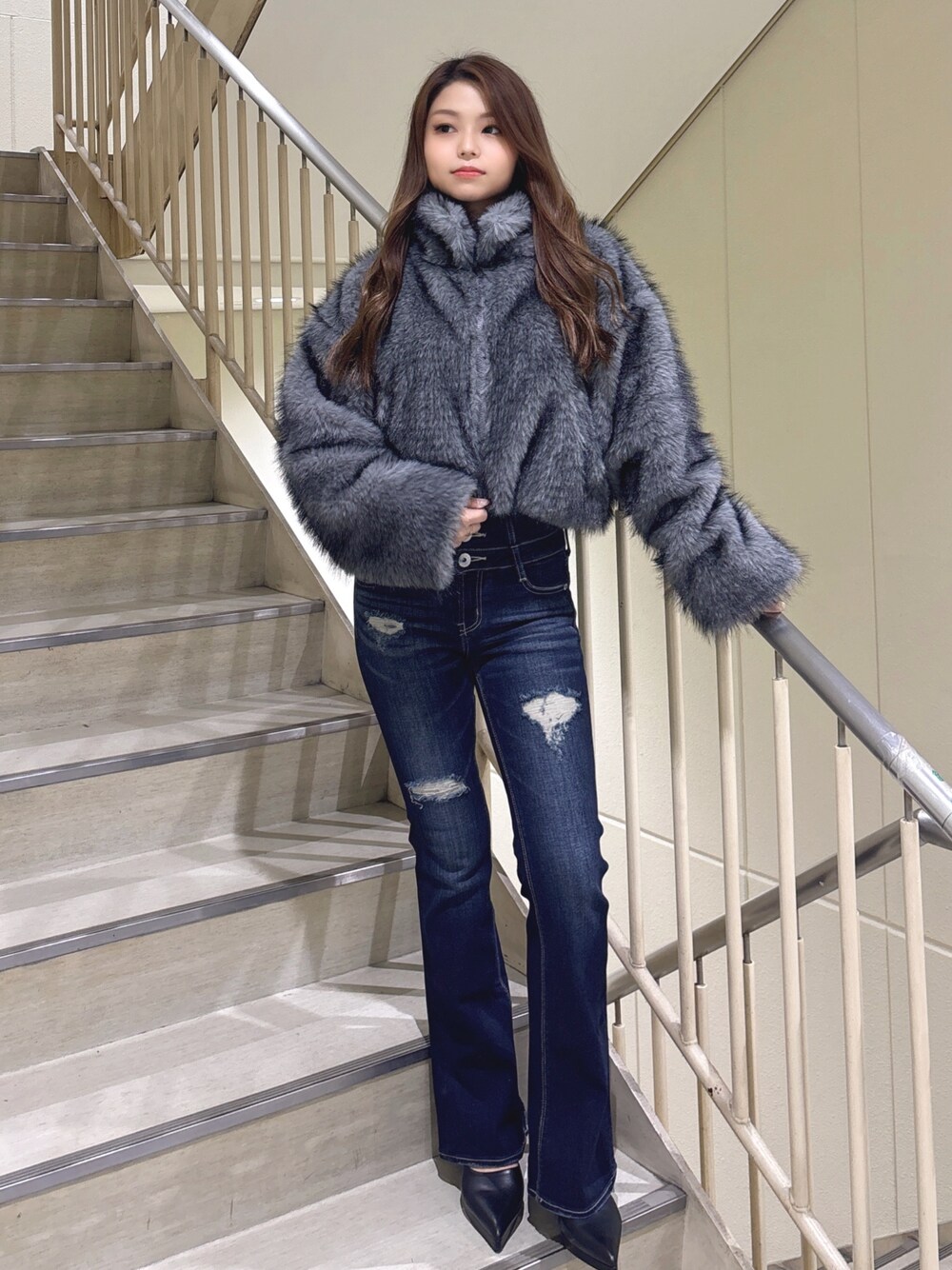 【アウター】 高級感のあるフェイクファーコート✨ ゆったりとしたサイズ感でとても軽くて楽に羽織れます✨首元にホックが付いているので首まで暖かく、マフラーいらずなのも嬉しいポイント! 【トップス】 シンプルでデイリー使いしやすいトップス✨ タイトなシルエットなのでアウターも羽織りやすくどんなコーデにも使えます!胸元の同色GYGYロゴがワンポイントで可愛い♡ 【ボトムス】 大人気だったH/Wクロスフレアからダメージバージョンが登場✨丈感少し長めに作られており、より脚長効果抜群です!シルエットもとっても綺麗です!身長156cmの私はXS着用してます! 【シューズ】 GYDA定番のポインテッドミュールに、ストームをプラスし、より高低差や安定感をアップさせたアイテム。高低差があまりないのでピンヒールでもより履きやすくなりました!23.0cmの私はMサイズでピッタリでした!