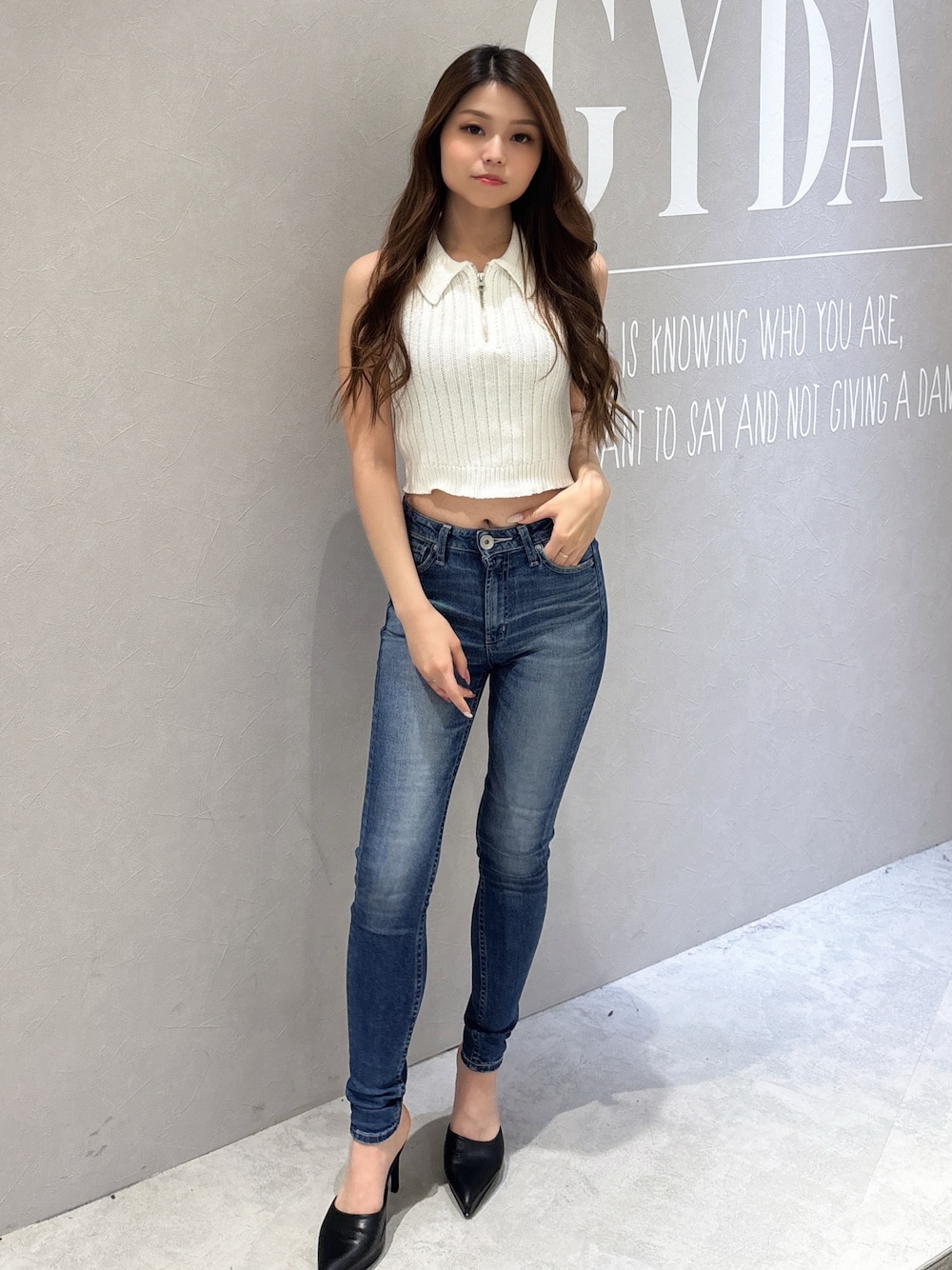 【トップス】 ブリーチファスナートップス✨ セットアップとしても着用可能なアイテムです! 首元の襟が上品さを出してくれて、着るだけでおしゃれになれます!ショート丈なのでハイウエストのデニムとも相性抜群! 【ボトムス】 とってもレアなノーダメージのスキニーが登場✨ ミドルウエストの丈感が美脚効果抜群です! シンプルなスキニーなのでどんなコードにも合わせやすく使いやすいです!私はSサイズで着用してます♡ 【シューズ】 GYDA定番のポインテッドミュールに、ストームをプラスし、より高低差や安定感をアップさせたアイテム。高低差があまりないのでピンヒールでもより履きやすくなりました!23.0cmの私はMサイズでピッタリでした!