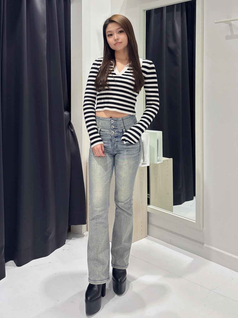 【トップス】 毎年大人気のPOLOニットトップスが今年も登場✨ ショート丈だからハイウエストと合わせると相性抜群!伸縮性もありとっても着心地が良いです✨ 【ボトムス】 3つボタンのハイウエストスキニー✨美脚効果,足長効果がバツグンです✨後ろのウエスト部分がクロスになっていてショート丈のTOPSと合わせると肌見せできて可愛いです♡私はXSサイズを着用してます! 【シューズ】毎年大人気の盛れるショートブーツが今年も登場♡細身に作られているので美脚効果はもちろん、足をしっかりと固定してくれて安定感があります✨本当にこのブーツ履くだけでー5キロになれます!普段23.0cmの私はMサイズでぴったりでした!