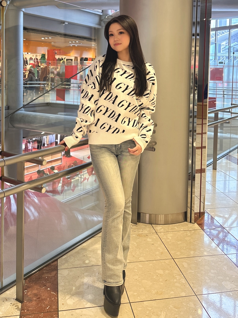【トップス】 店頭で大人気のGYDAパターンニットが登場! 総ロゴがGYDAらしさを出してくれます✨ ゆったりとしたサイズ感なので体型カバーもしてくれます! 【ボトムス】大人気だったH/Wクロスフレアがバージョンアップして登場✨丈感少し長めに作られており、より脚長効果抜群です!シルエットもとっても綺麗です!身長156cmの私はXS着用してます! 【シューズ】毎年大人気の盛れるショートブーツが今年も登場♡細身に作られているので美脚効果はもちろん、足をしっかりと固定してくれて安定感があります✨本当にこのブーツ履くだけでー5キロになれます!普段23.0cmの私はMサイズでぴったりでした!
