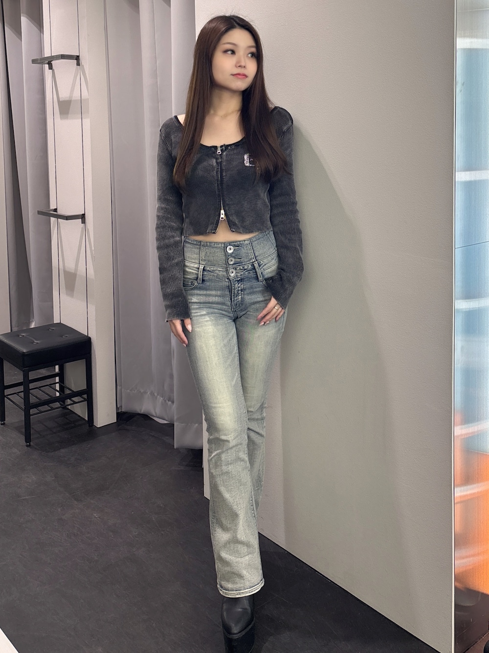 rimika(GYDA)のニット/セーター「GG bijou ZIPブリーチニットショートトップス」を使ったコーディネート