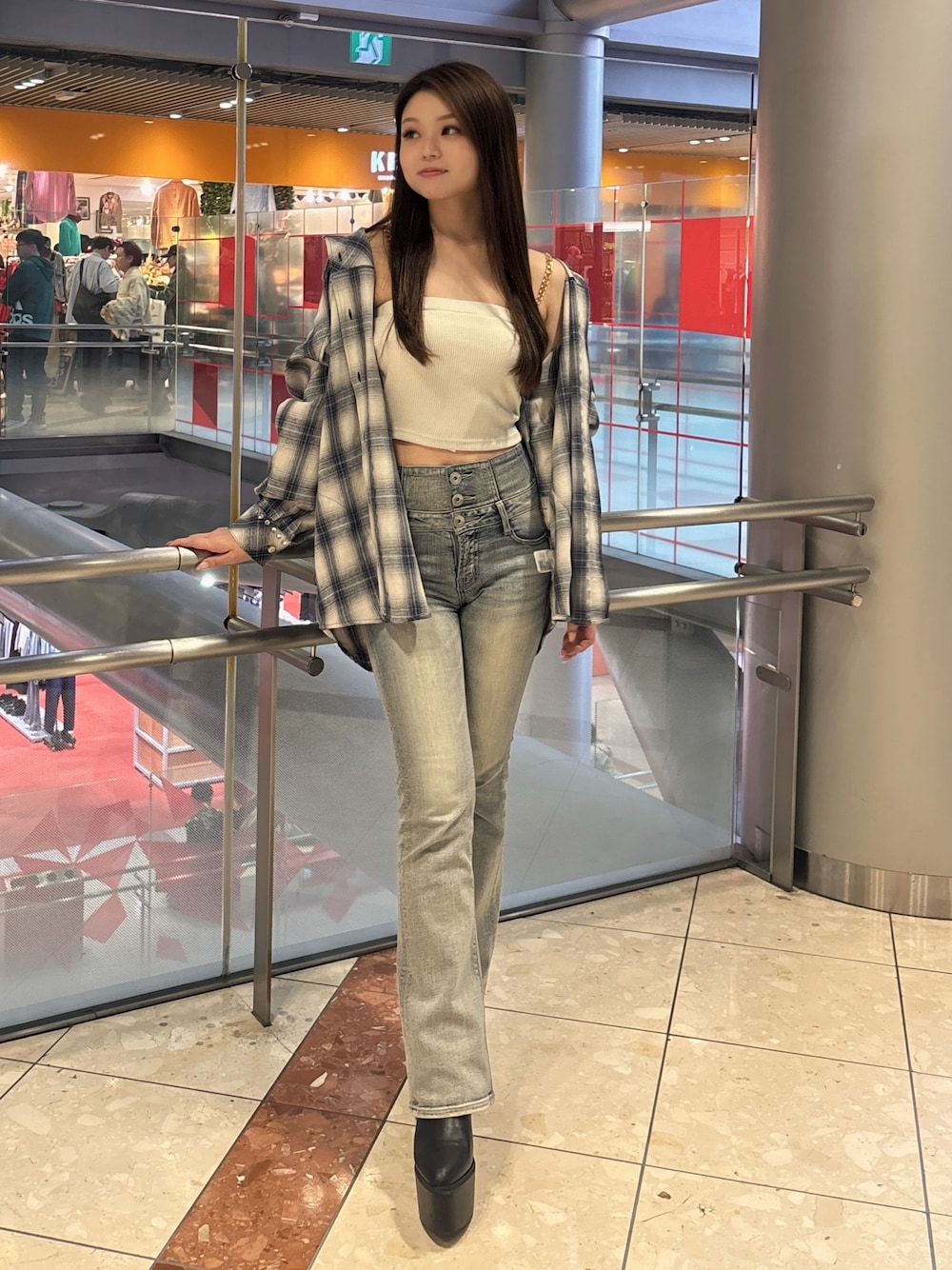 【トップス】 ビジュー付きのチェックシャツが登場✨ ゆったりとしたサイズ感で、体型カバーもしてくれます!季節問わず、デイリー使いしやすい一枚です! 【ビスチェ】 大人気のチェーンビスチェ✨ チェーン部分取り外し可能なのでベアトップとしても使って頂けます!パット付きなので1枚で着用できてとっても楽です♡ 【ボトムス】大人気だったH/Wクロスフレアがバージョンアップして登場✨丈感少し長めに作られており、より脚長効果抜群です!シルエットもとっても綺麗です!身長156cmの私はXS着用してます! 【シューズ】毎年大人気の盛れるショートブーツが今年も登場♡細身に作られているので美脚効果はもちろん、足をしっかりと固定してくれて安定感があります✨本当にこのブーツ履くだけでー5キロになれます!普段23.0cmの私はMサイズでぴったりでした!