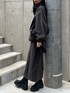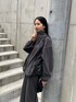 グレーのセットアップにブラックの小物を合わせた大人カジュアルコーデ。