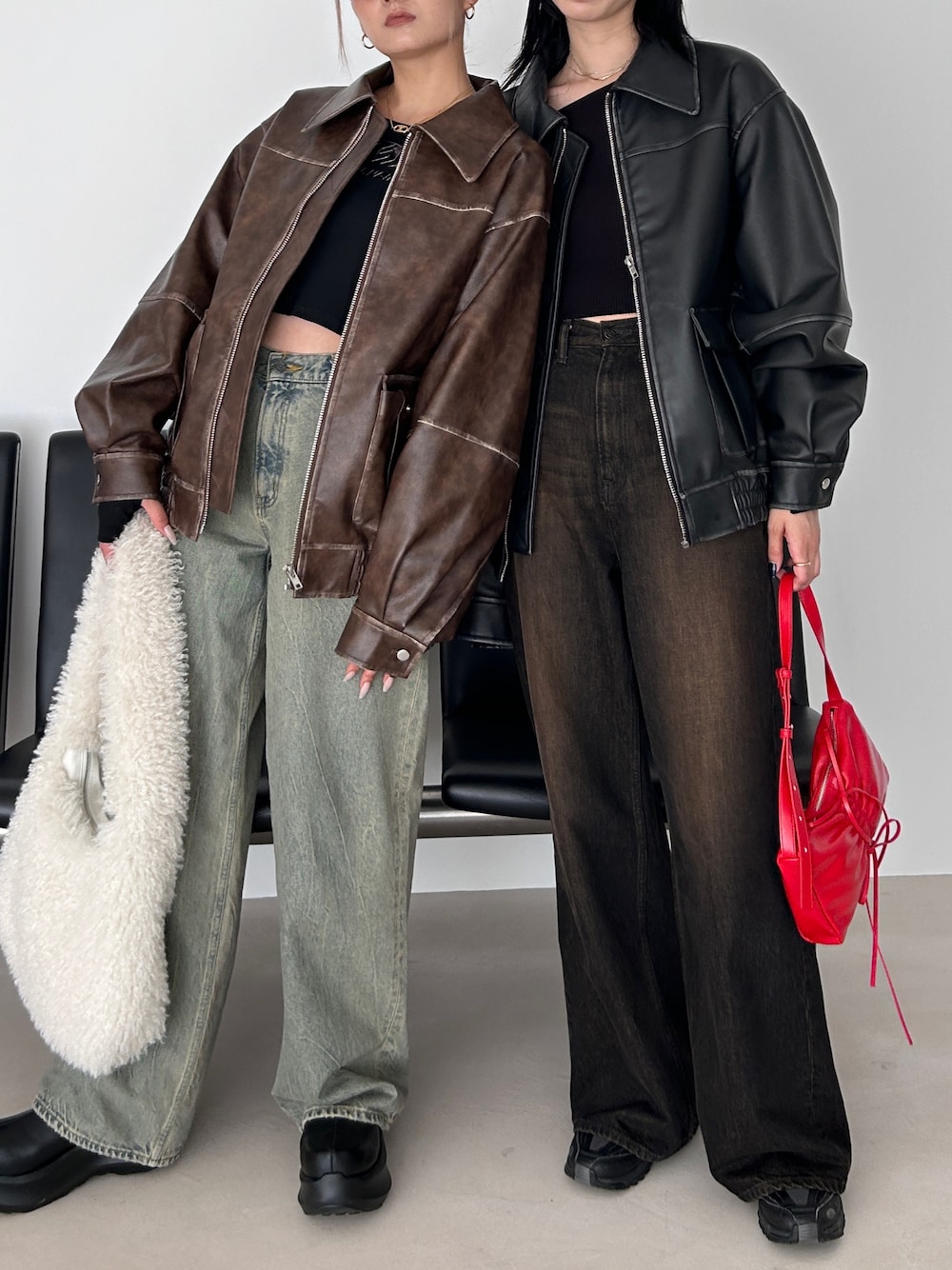 人気のレザーブルゾンコーデ あえてゆるっとしたデニムと合わせてモードカジュアルにしたのがポイントです! ブルゾンは169cmの私でもヒップが隠れるゆったりとしたサイズ感なので厚めのニットの上からでも羽織ることが可能です!