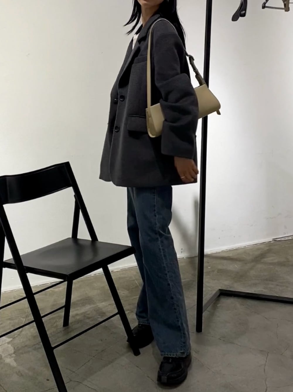 ジャケットコーデ グレーのジャケットは169cmの私でもヒップが隠れるくらいのサイズ感です! デニム・スニーカーと合わせるとカジュアルすぎちゃうのでバッグはきれいめなシルエットのものを。 大人カジュアルなジャケットコーデぜひ参考にしてみてください!