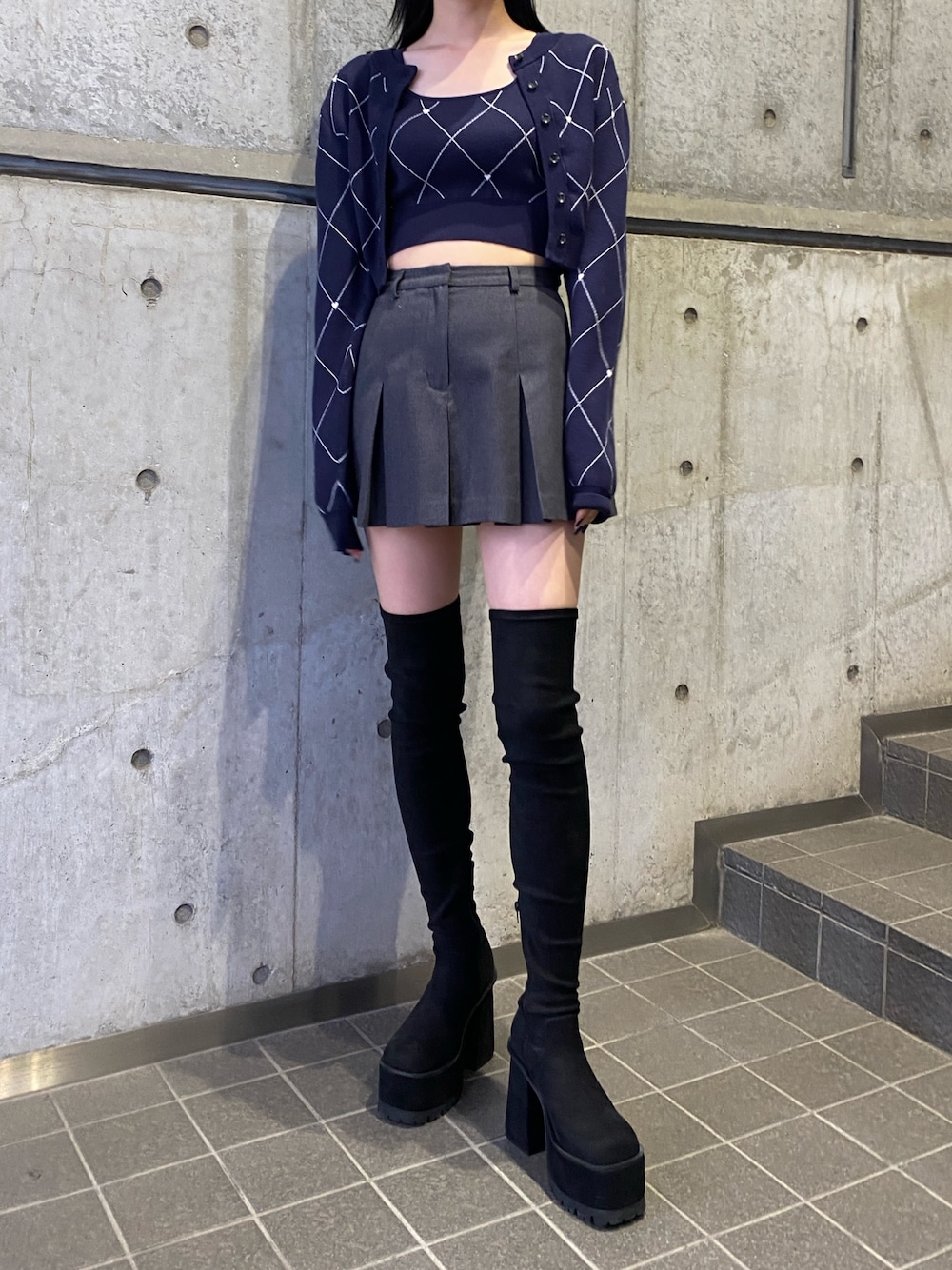 ロングブーツコーデ ニーハイのブーツは伸縮性があるので着脱しやすく、またヒール部分は厚底になっているので歩きやすいです!