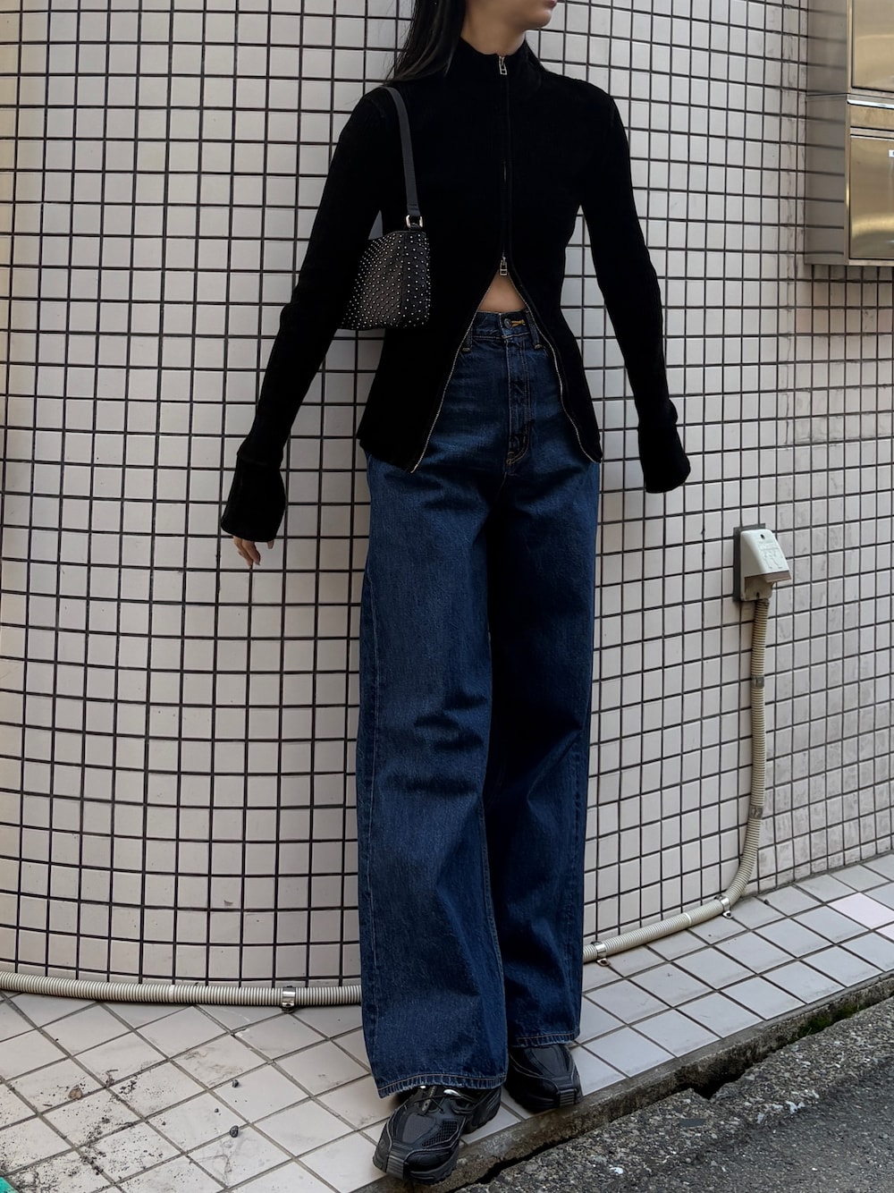 おすすめデニムコーデ 着用しているデニムはワイドですがハイウエストデザインなので脚のシルエットを綺麗に見せてくれます! ぴったりめのトップスと合わせてメリハリつけるコーデがおすすめです!