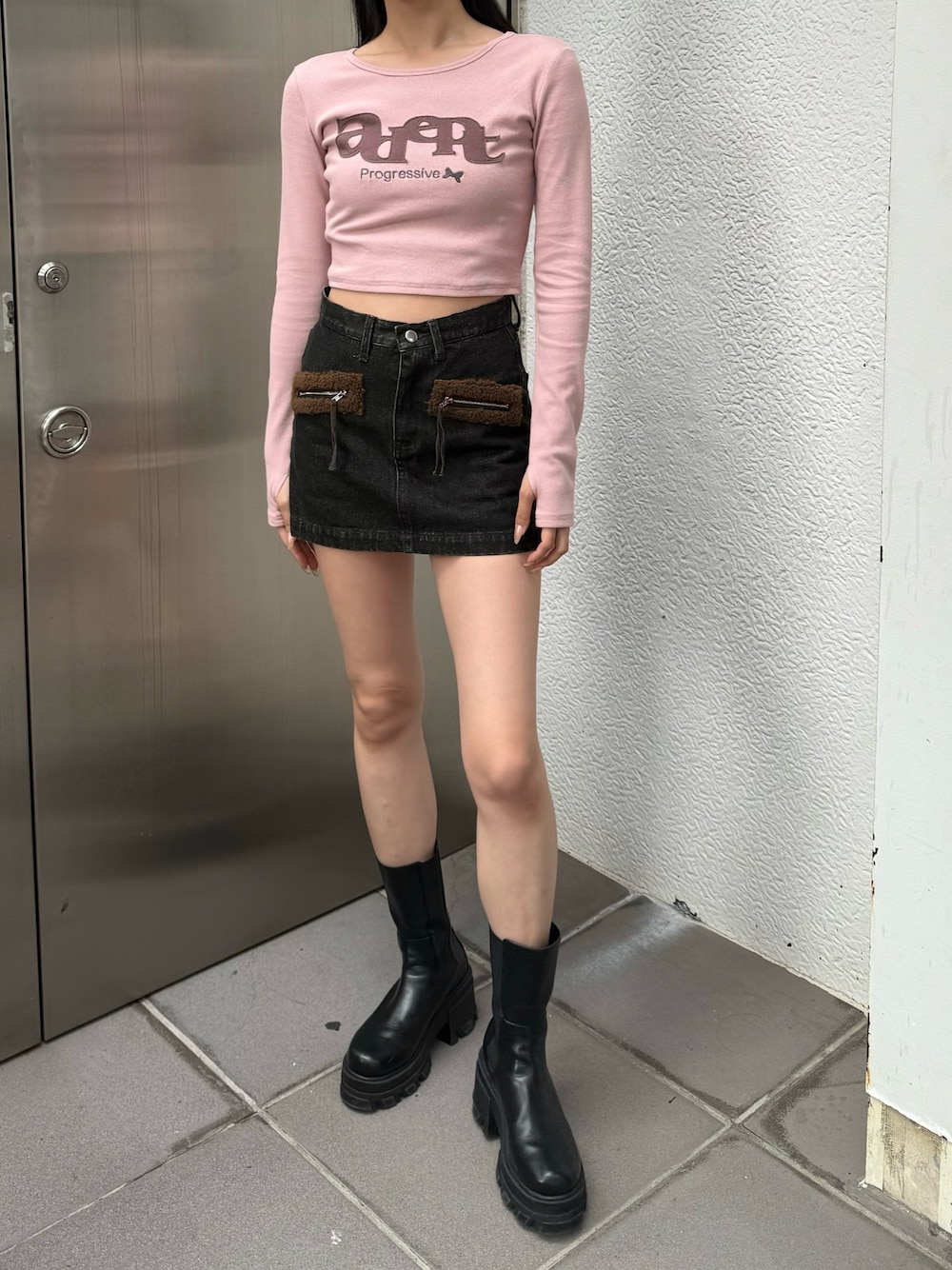ピンクのトップスをポイントとしたコーデ。デニムはポケットの部分がボア素材になっているので冬感がでて、今の時期おすすめです!