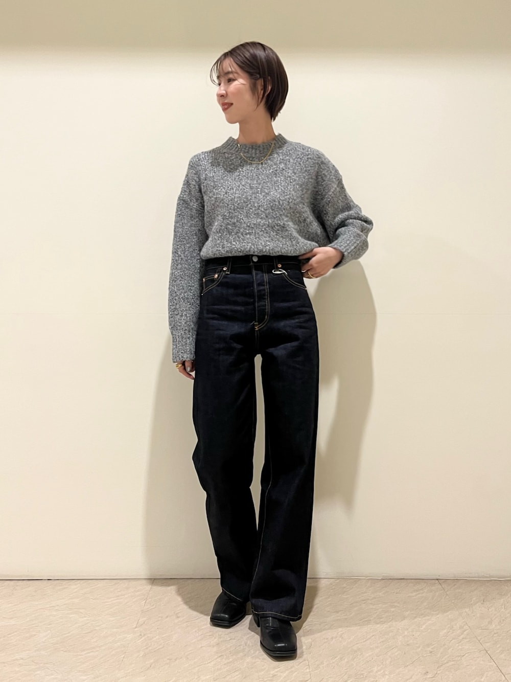 【tops】 モヘヤ混なので、とても暖かいです☺️ 今年は丈感が少し短くなったため、インした時のもたつきが感じにくくなりました✨ 【bottoms】 ハイウエストと丈感もしっかり長さがあり、履くだけで足が長く見えるデニム👖 足元もブーツを持っていくとさらに綺麗に見えるのでおすすめです🩵 身長163cm、24インチを履いて少し足にたまる丈感です🙆🏻♀️