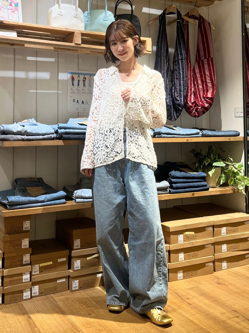 【tops】 大きめのレース編みがかわいいシャツ🤍 手首とウエストにきれいなくびれができ、細見えするシルエットです☺️ ボタンを上下2つずつくらい開けて着て頂くと、抜け感が出ておすすめです🫶 【inner】 胸元がちょうどいい開き具合で、色んなシーンでお使いいただけるタンクトップです🌼 ピタッとし過ぎない、少しゆとりのあるシルエットなので、1枚で着た時も体のラインを拾いにくいです🙆🏻♀️ 【bottoms】 ボリューム感たっぷりのルーズなデニム👖 ウエストにタックがあるので、ボリューム感があってもすっきり見えするシルエットです✨ 身長163cm、24inch着用で腰で履いて少し引きずる丈感です◎
