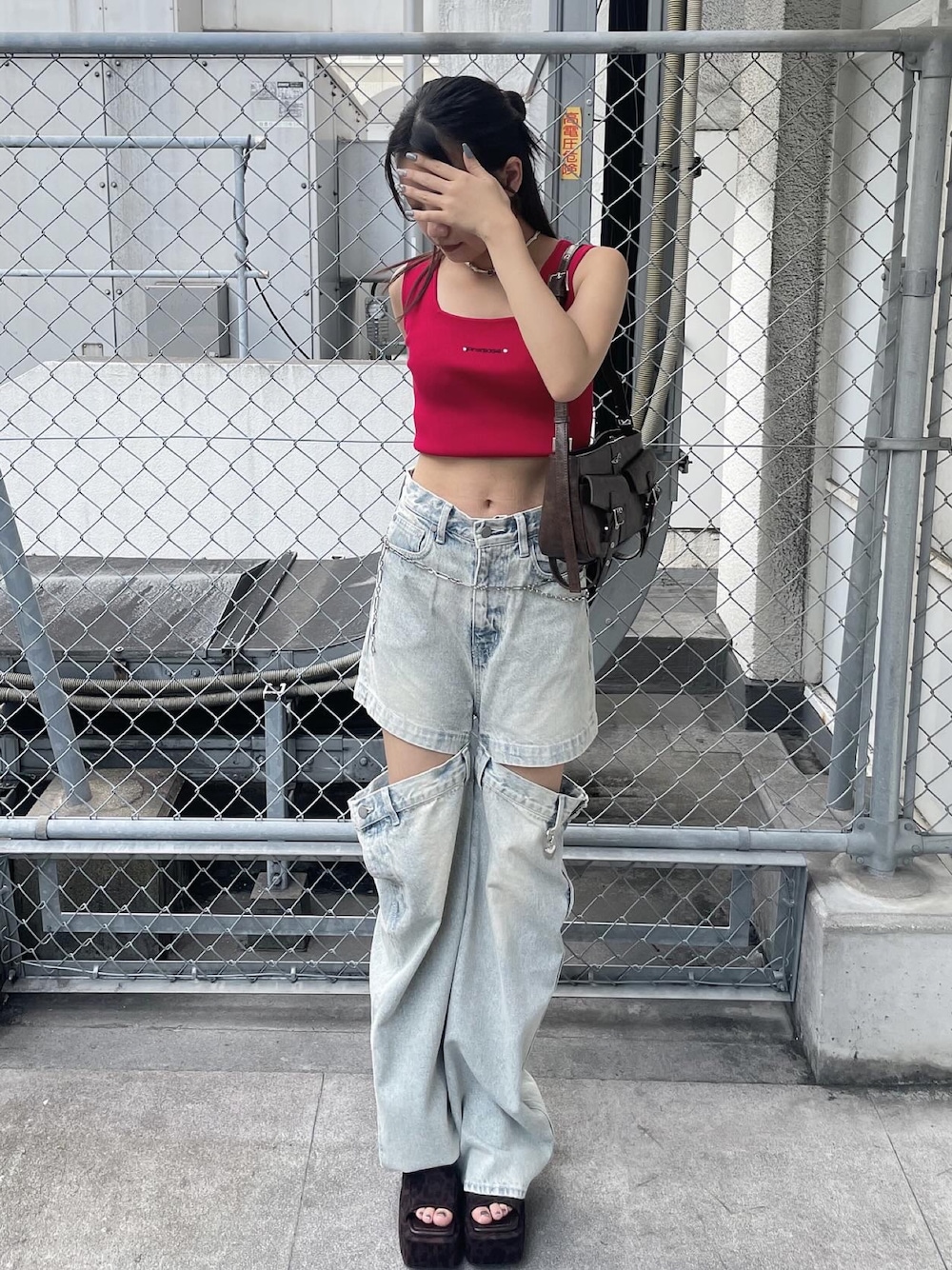 Tops : ストーンがワンポイントで可愛いタンクトップ♡ ピタッとしててインナー気にしなくていいのもポイント💡 denim : カットがガッツリ入ってるおかげで足細く見えるデニム 👖 取り外し可能なハートチャームも激カワ🤍ྀི 160cmでSサイズでゆるっとした丈感で履けますっ! sandal : 脱ぎ履き楽ちんなのに歩きやすい!ヒール感全然なくて厚底感覚で歩けちゃいます🪽23.5cmでMサイズ着用してます!