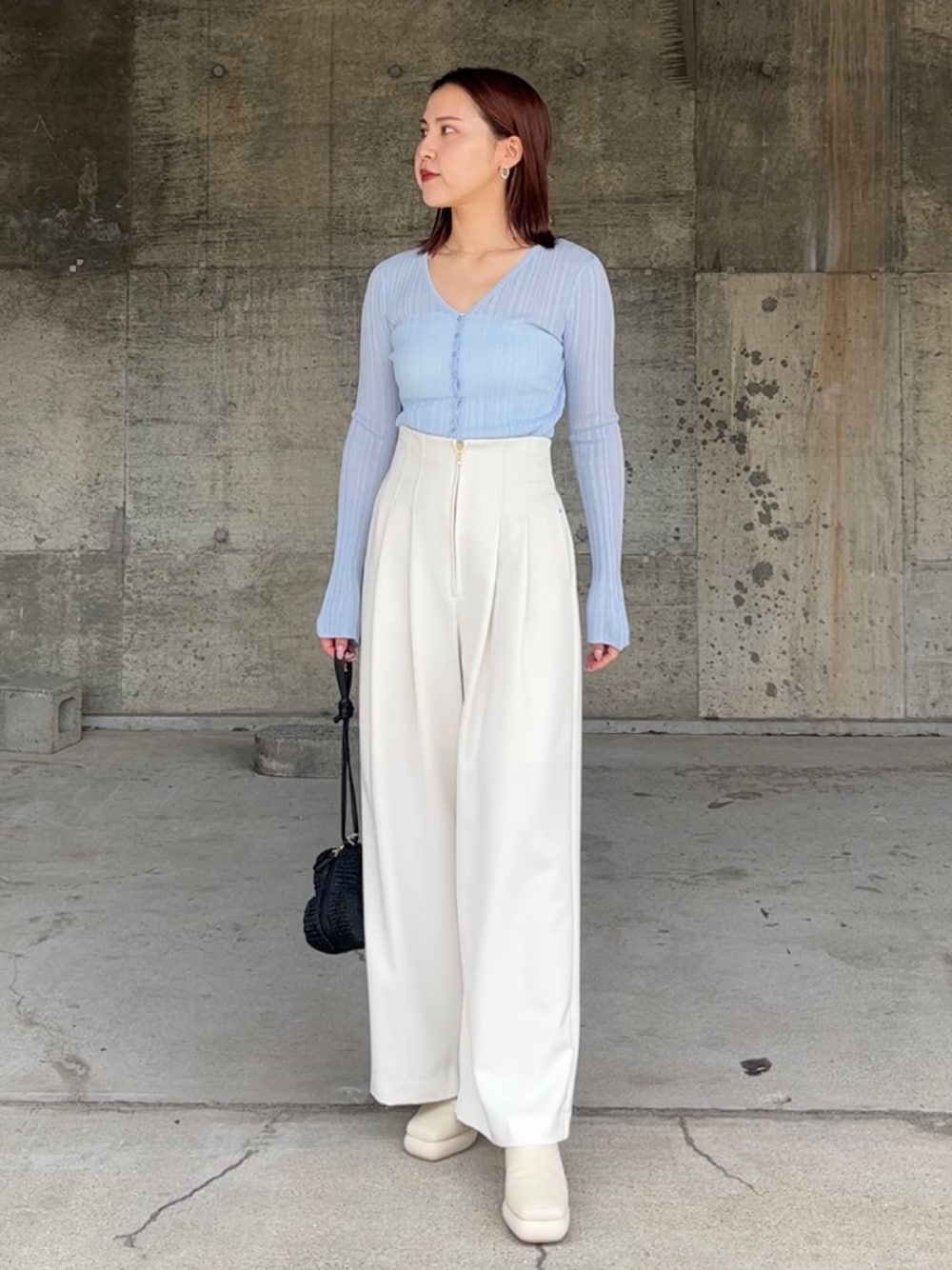 《トップス》 前後2wayで着用頂けるトップス。 シアーとフレアなお袖が 一枚でトレンド感がでます🤭 伸縮性のある生地なので二の腕周りも ぴたっとしすぎないです。 《パンツ》 美シルエットとハイウエストで 脚長効果抜群な一枚。 履き心地は締め付け感なくとても楽ちんです。 綺麗目なスタイル、カジュアル目なスタイル、幅広くあわせていただけます🤍 ◎159cmS着用 足首まで隠れる丈感です。 《シューズ》 前も厚めのヒールなので 疲れなくてとても楽ちんです! 何にでも合うシンプルなデザインなので この春もっておいてほしい一足です🤍 ◎Mサイズ着用 《バック》 ラグナムーンにしかないデザインの インパクトのあるバック。 シンプルなコーデのアクセントに🤭