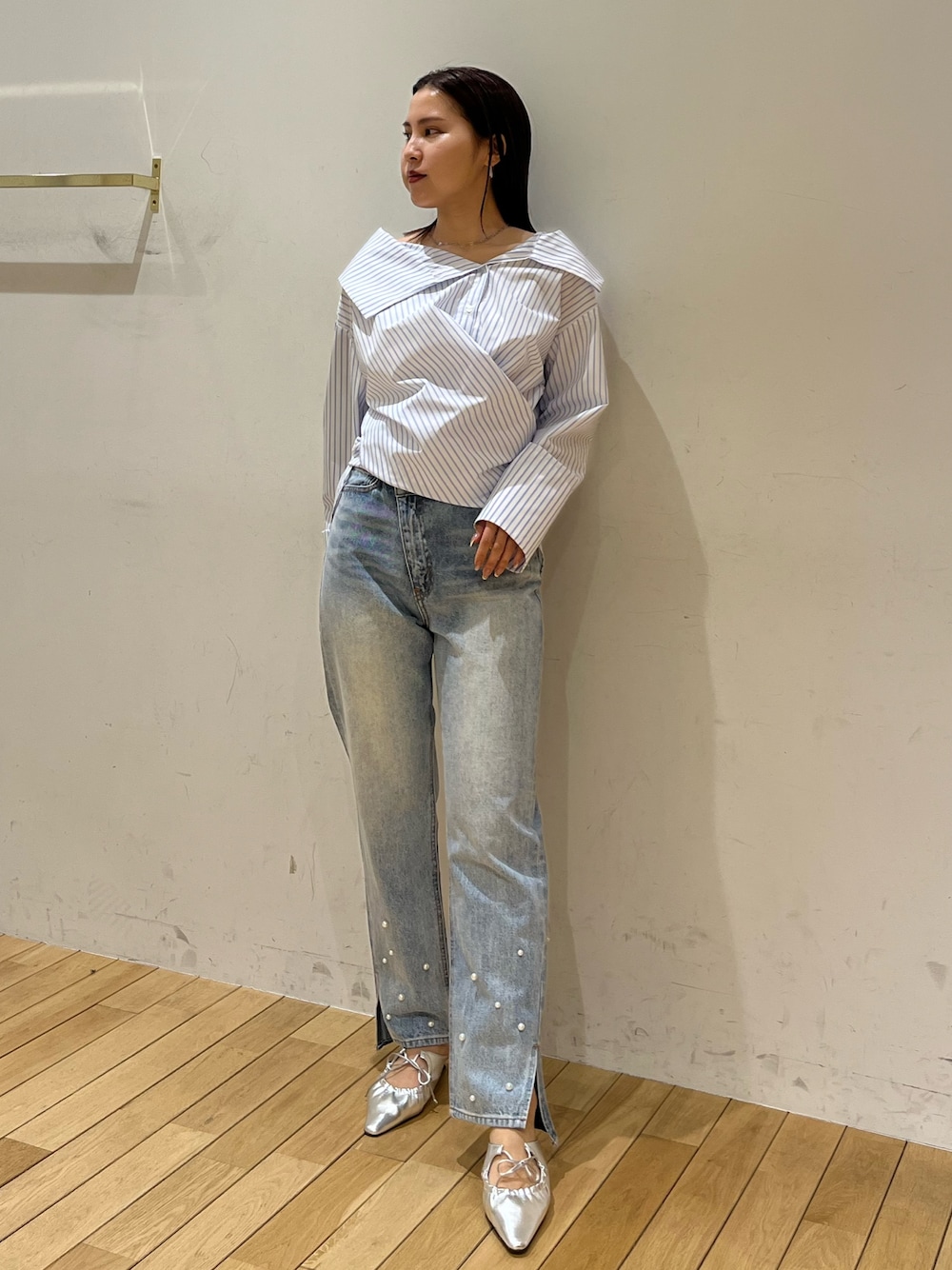 《トップス》 着こなし方な沢山な着回したい方に オススメな一枚!!🤍 デコルテもすっきり見えてゆるっと 着てもスタイルアップが叶います! 《デニム》 パール付きのインパクトあるデニム。 裾のスリットから足首がちらっと見えて 美脚に見えるのがお気に入りポイント🌼 ポケット位置上めなのでヒップアップ効果も! ◎159cm Mサイズ 《シューズ》 低めのヒールで楽ちん! 紐で幅を調節できるので 足のお悩みにそって履いて頂けます🙆♀️