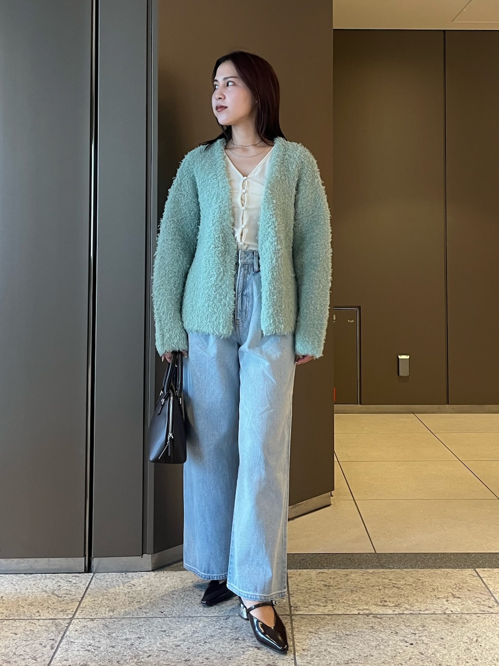 《アウター》 パキッとしたグリーンが可愛い! 重たくなくふわふわな触り心地✨ 真冬はレイヤードも楽しめそう! 《インナー》 一枚でもレイヤードしても可愛い! 着まわせるので夏も秋も出番が多そう💓 《パンツ》 ずるっとしたシルエットのデニム。 タックが腰回りにあるため ウエストやお尻がすっきり見えます✨ ◎159cm S 《バック》 コンパクトなサイズ感だけど 以外と荷物が入る万能なバック。 お出かけにも子供連れの日にも◎ 《シューズ》 さっと履きやすい形がお気に入り🤍 ストラップ付きで安定感があり ヒール部分のデザインも可愛い!