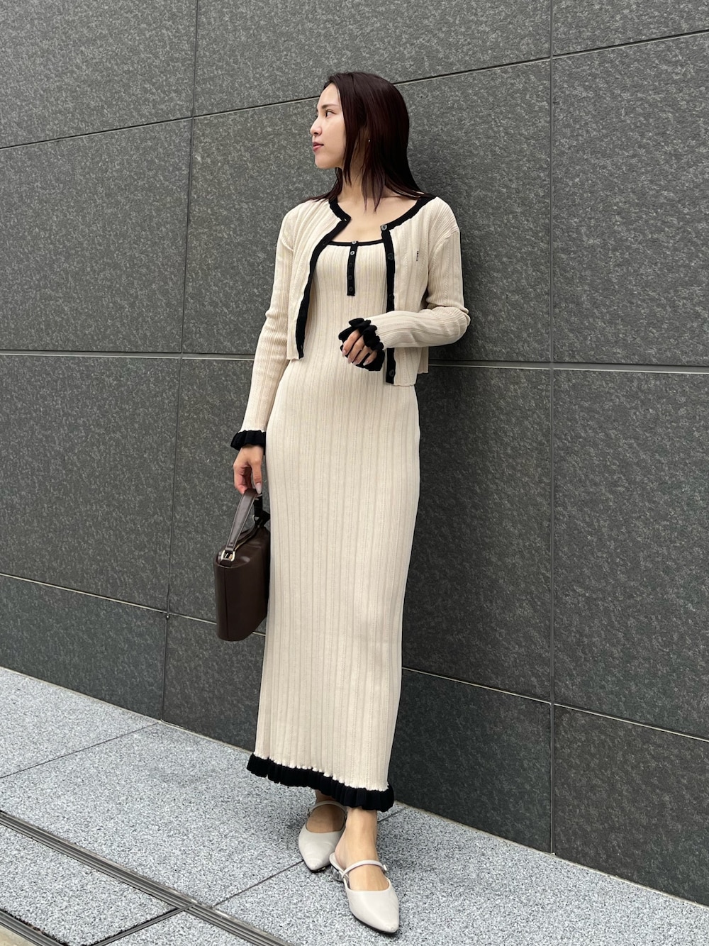 《カーディガン》 ショート丈で羽織るだけで 脚長効果!!✨ 袖のフリルが可愛い😌🤍 《ワンピース》 伸縮性があり着心地抜群! Iラインシルエットが スタイル良く見せてくれます✨ ◎159cm Sサイズ着用
