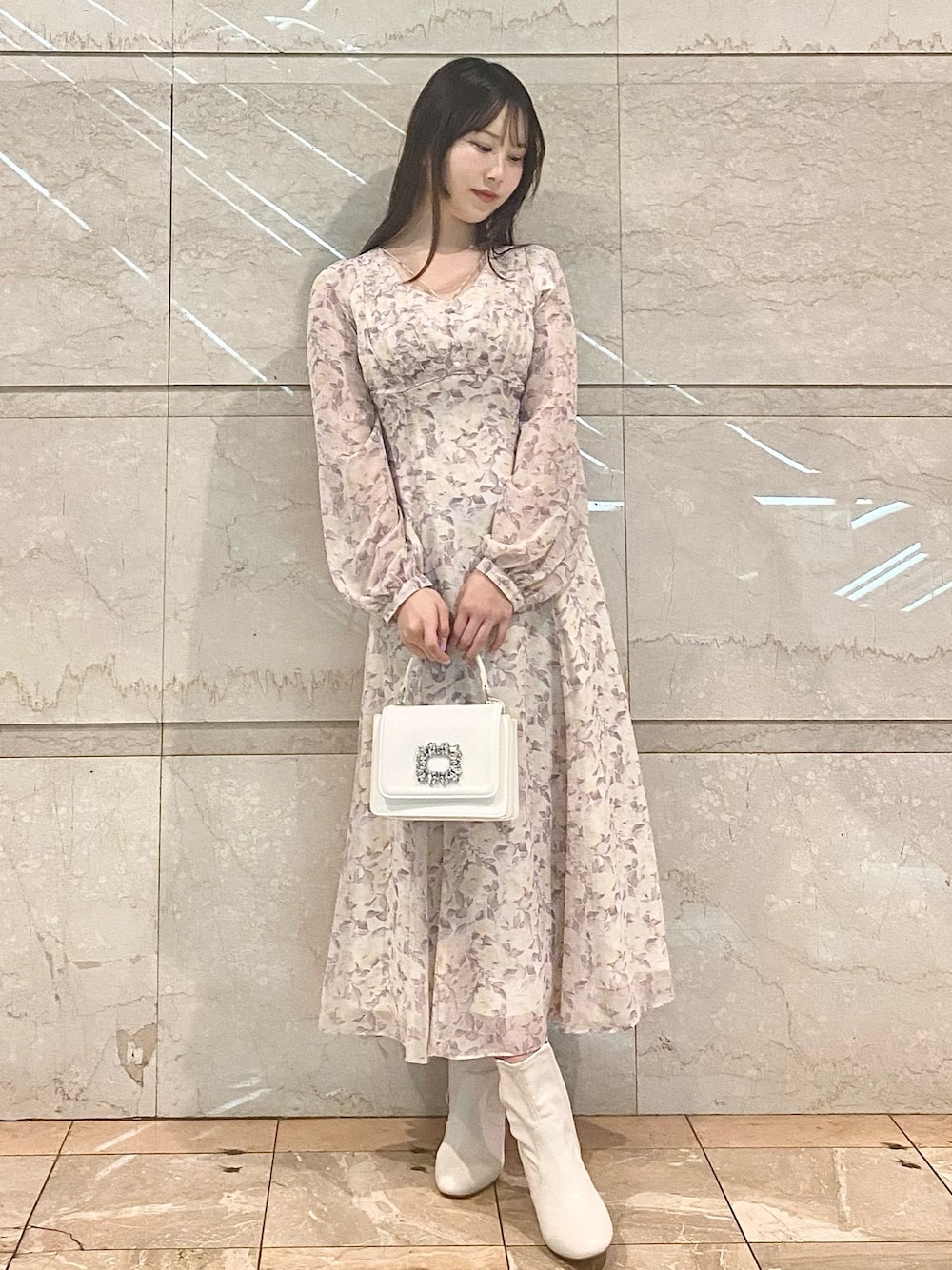 ワンピース、サラッとしたシアーの素材で女性らしいスタイル♡ウエストすっきりなので苦しくないし着膨れも心配入りません! 身長155cm、Sサイズ着用で足首より8cmほど上の丈感です^^ バッグ、ビジューが華やかで上品見え! ショルダーが2タイプついてるので組み換え自由にできます!
