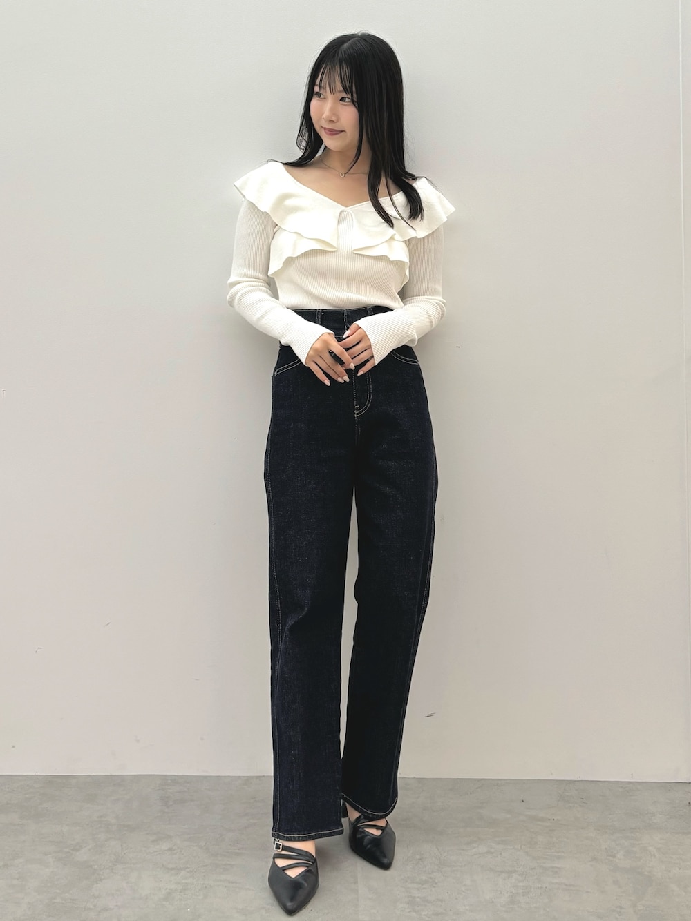 【トップス】 前後2wayでフリルが変わります。 程よいフリルで首元すっきりです。 【パンツ】 ストレートデニム。 ストレッチが効いててかなり履きやすいです。 【シューズ】 つま先が隠れるので季節感もバッチリ。 普段24cm、38サイズでジャストです。