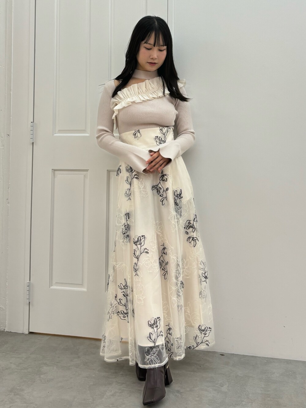NANA(MERCURYDUO)のスカート「エンブロイダリーオリジナル花柄刺繍フレアスカート」を使ったコーディネート