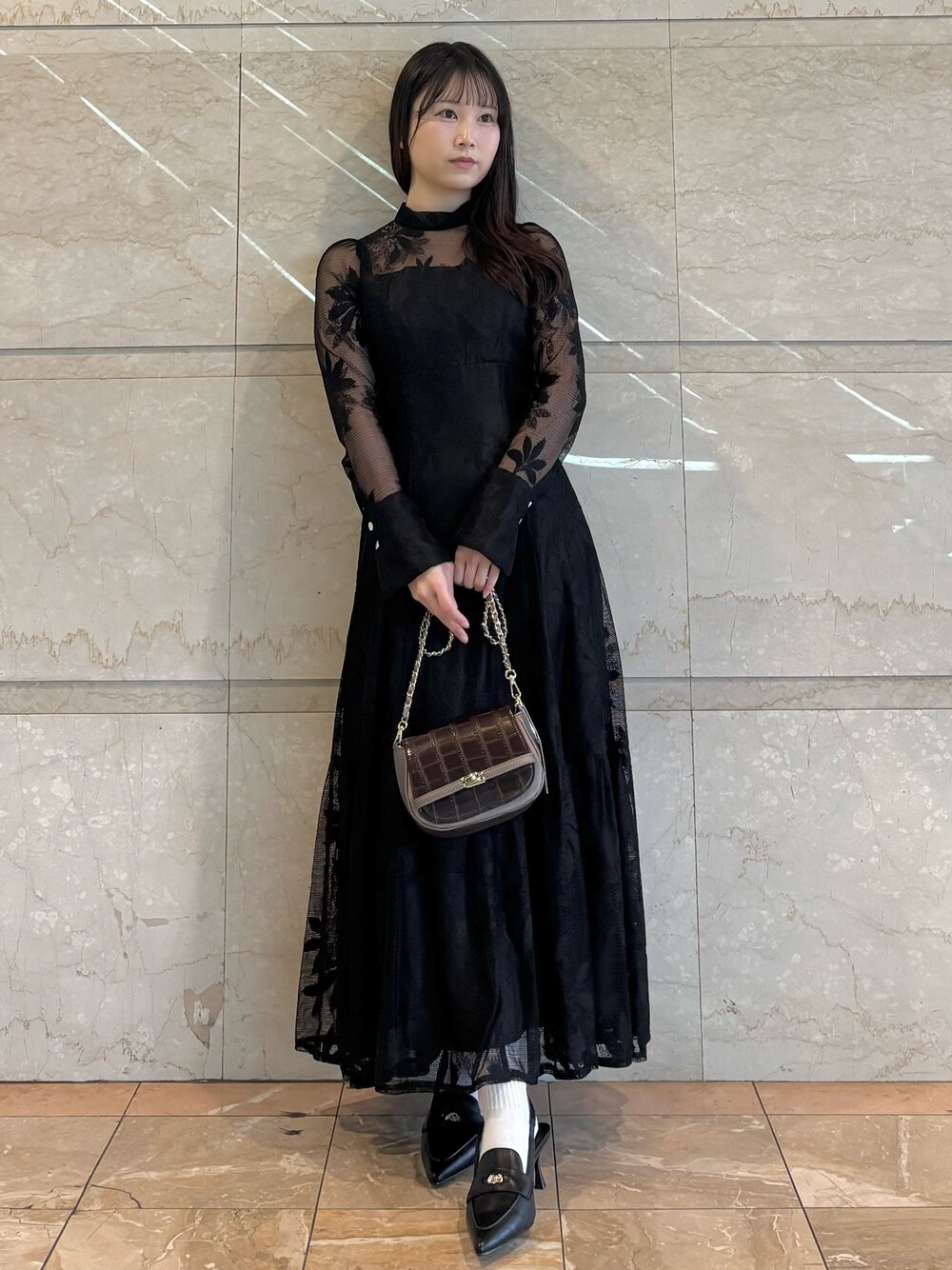 【ワンピース】 タイトめなシルエットが綺麗めクールな印象に。 程よい透け感で大人見え間違いなし。 身長155cm、Mサイズで足首下の丈感です。 【バッグ】 ミニバッグでチェーンがおしゃれ。 【シューズ】 後ろにバンドがついてるので固定されて歩きやすいです。 普段24cm、38サイズでジャストです。