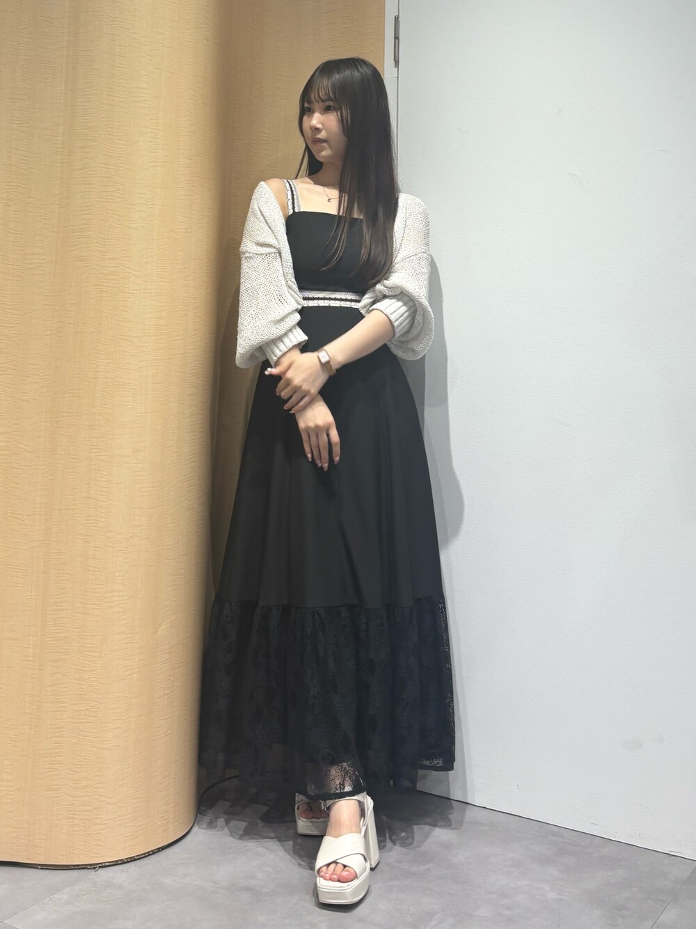 cardigan》キラキラしてて大人気です! one-piece》バイカラーで、トップの部分はフィット感がありますが、後ろファスナーで着脱できます!裾のレースがふんわり広がって可愛いです!M着用で足首下の丈感です! shoes》10cmヒールでスタイル盛れます!安定感バツグンで疲れにくいです!36着用でぴったりです!