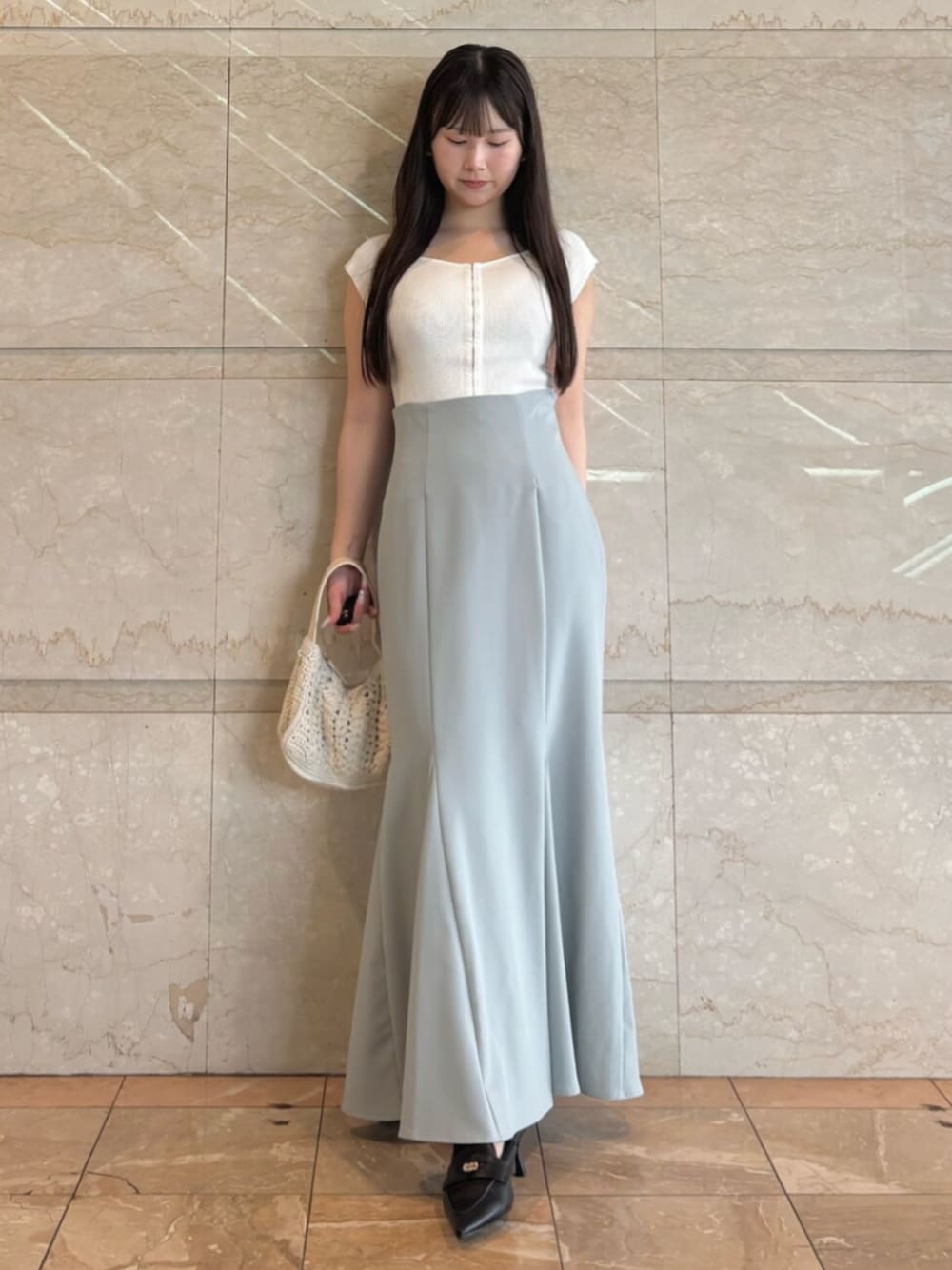 tops》フレンチスリーブのコンパクトなニットは、何にでも合わせやすいです! skirt》M着用で足首隠れる丈感です!新色バックレースでスリットも入ってるので足捌きしやすいです! bag》コロンとしたデザインが可愛いです! shoes》38着用でぴったりです!