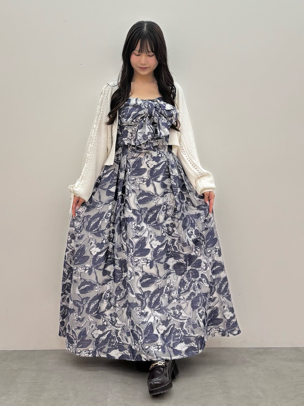 cardigan》ショート丈で後ろ姿も着膨れせず着れます! one-piece》ジャガードのようなキャミワンピは、胸元に大きいリボンがついてて大人かわいいです!M着用で足首下の丈感です! shoes》安定感バツグンで疲れにくいです!36着用でぴったりです!