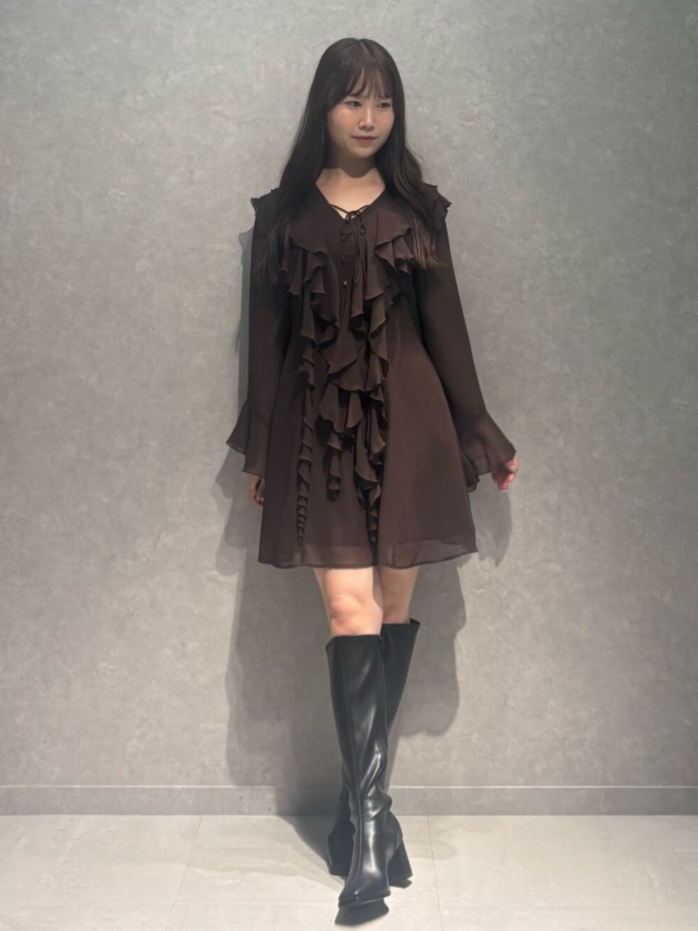 one-piece》シフォン素材で袖など程よい透け感があります!フロントのフリルは動きが出るデザインで可愛いです!M着用で膝上10cmほどです!後ろファスナーで着脱も簡単です! shoes》美脚になれるロングブーツは、安定感バツグンで疲れにくいです!36着用でぴったりです!
