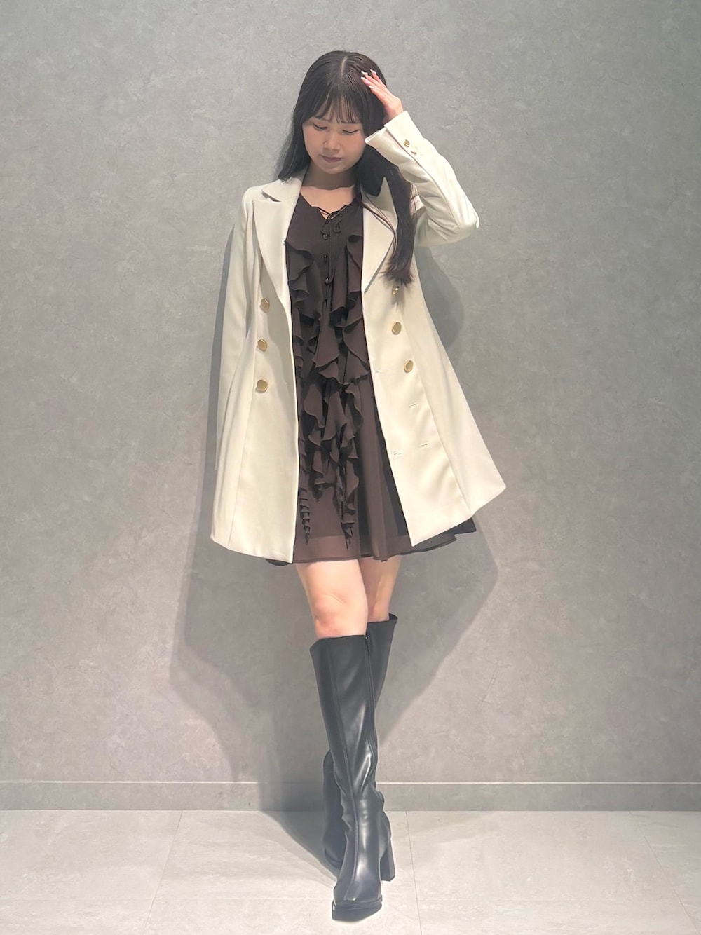 jacket》羽織としても使える万能ワンピは、ミニワンピとの相性抜群です! one-piece》シフォン素材で袖など程よい透け感があります!フロントのフリルは動きが出るデザインで可愛いです!M着用で膝上10cmほどです! shoes》美脚になれるロングブーツは、安定感バツグンで疲れにくいです!36着用でぴったりです!