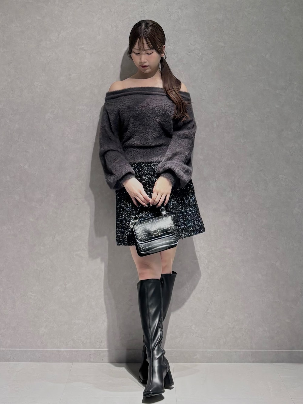 tops》ふわふわシャギーシリーズのオフショルバージョンは、秋のおすすめアイテムです! skirt》ブラック×ブルーのツイード生地で他と被りません!台形なので足もスッキリ見えます!S着用で膝上10cmほどで大人なミニです! bag》チェーンもついてて肩掛けにもできます! shoes》安定感バツグンで疲れにくいです!36着用でぴったりです!