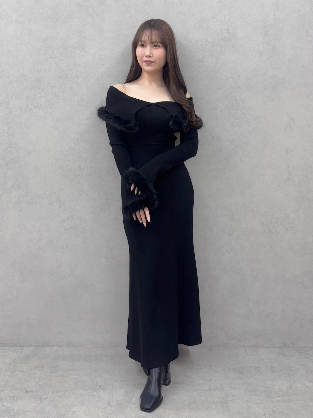 NANA(MERCURYDUO)のワンピース「ファートリミングニットワンピース」を使ったコーディネート