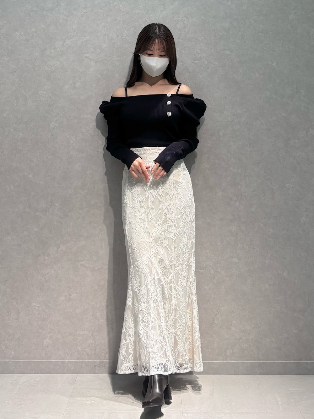 tops▶︎ビジューがキラッとしてかわいいパフスリーブの華奢見えニットです! skirt▶︎バックレースでウエスト調節可能、マーメイドシルエットでスッキリ着れます!M着用で足首下の丈感です! shoes▶︎安定感バツグンで疲れにくいです!36着用でぴったりです!