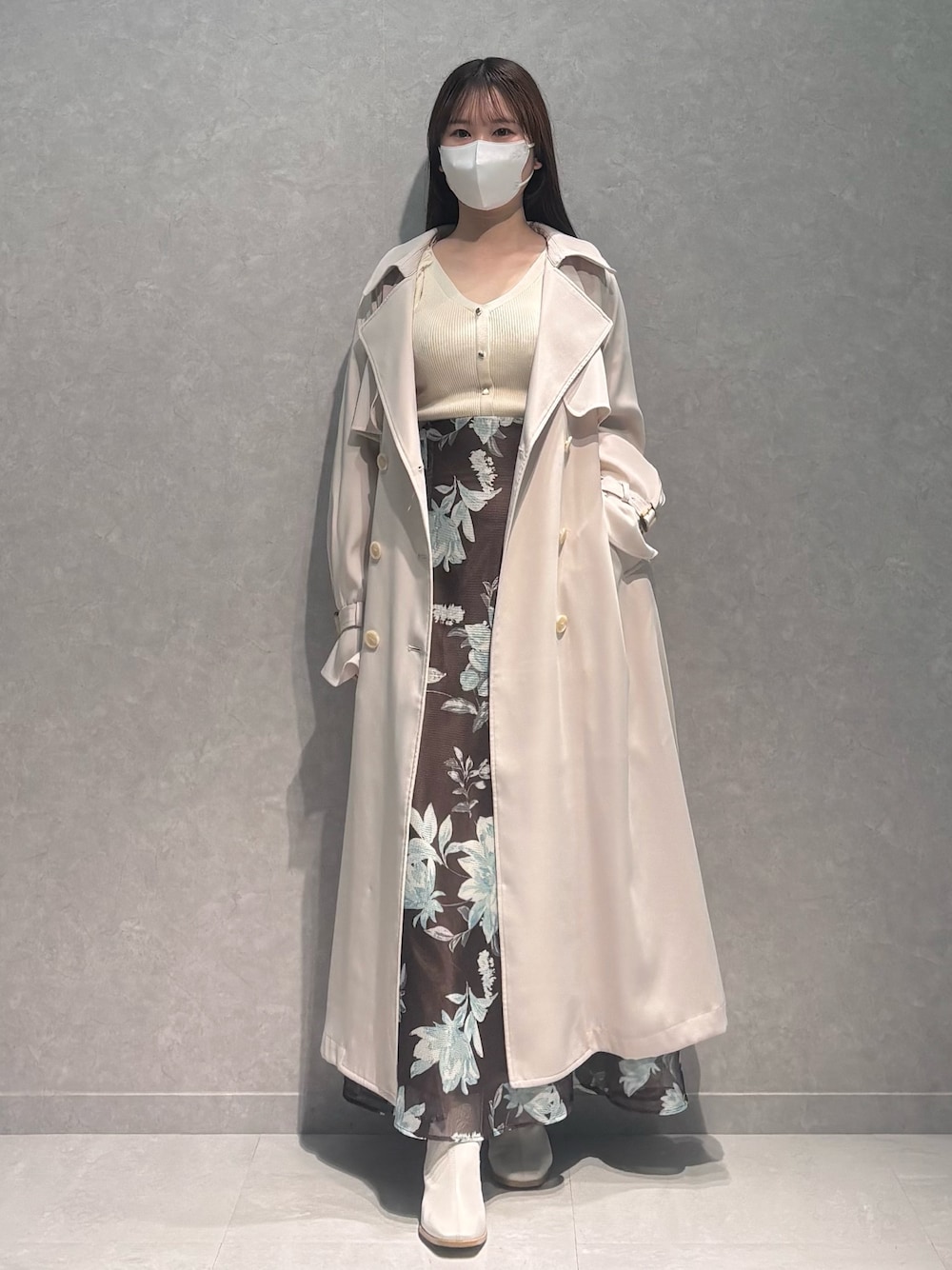 outer▶︎シンプルデザインのトレンチコートはどんなカラーにも合わせやすいからマストアイテムです!M着用で足首にかかる丈感です! tops▶︎着るだけでお上品な雰囲気纏えます!袖がオーガンジーなので肉感拾わず華奢見えしてくれます!お仕事着やデートにも春っぽくておすすめ! skirt▶︎ミントカラーの花柄が目を引く今年っぽいカラーです!M着用で足首下の丈感です! shoes▶︎安定感バツグンで疲れにくいです!36着用でぴったりです!