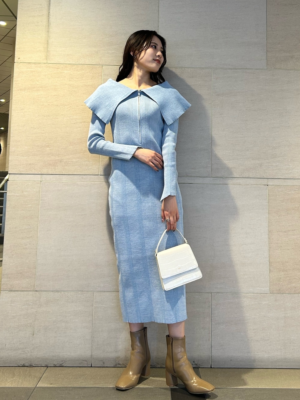 【トレンド!ペールトーン春ワンピ🩵】 "小顔効果"抜群ビッグカラーがポイントのニットワンピース。 生地は分厚すぎないしっかりめニットで、程よくピタッと身体のラインを見せてくれます♡ リブが入っているので、縦にすらっとスタイルアップも叶います♡ ビッグカラーで抜け感が出て可愛すぎないので、大人っぽくきていただけます。 足元はスニーカー・パンプス・ブーツなどで、雰囲気変えていただくのもオススメです✨